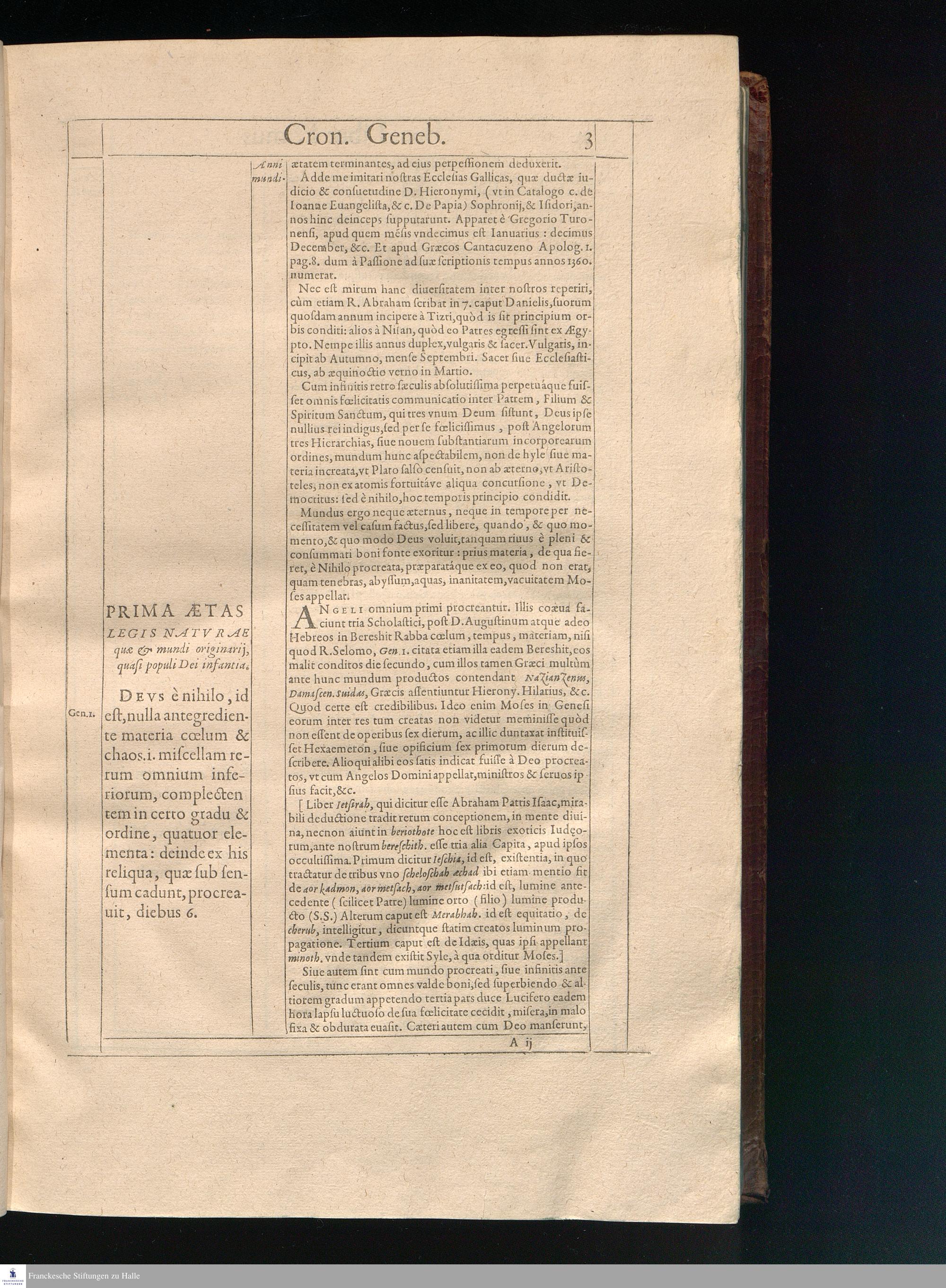 GILB. GENEBRARDI || THEOLOGI PARISIENSIS || DIVINARVM HEBRAICARVMQVE || LITERARVM PROFESSORIS REGII || Chronographiæ Libri quatuor. || PRIORES DVO SVNT DE REBVS VETERIS || populi, & præcipuis quatuor millium annorum gestis. || Posteriores, è D. Arnaldi Pontaci Vasatensis Episcopi Chronographia || aucti, recentes historias reliquorum annorum complectuntur. || Vniuersæ historiæ speculum, in Ecclesiæ præsertim sæculo, à mendaciis, malus, || imposturis Centuriatorum, aliorúmque hæreticorum detersum. || Emendatum, Adauctum etaim, & collocupletatum cum Appendice ad A. D. || M. D C. Iubilæum Maximum & sæcularem. || Per PETRVM VICTOREM PALMAM CAIETANVM I. V. D. & Regium || linguarum Orientalium Lectorem & anagnosten. || Subiuncti sunt libri Hebræorum Chronologici eodem || interprete Genebrardo. ||