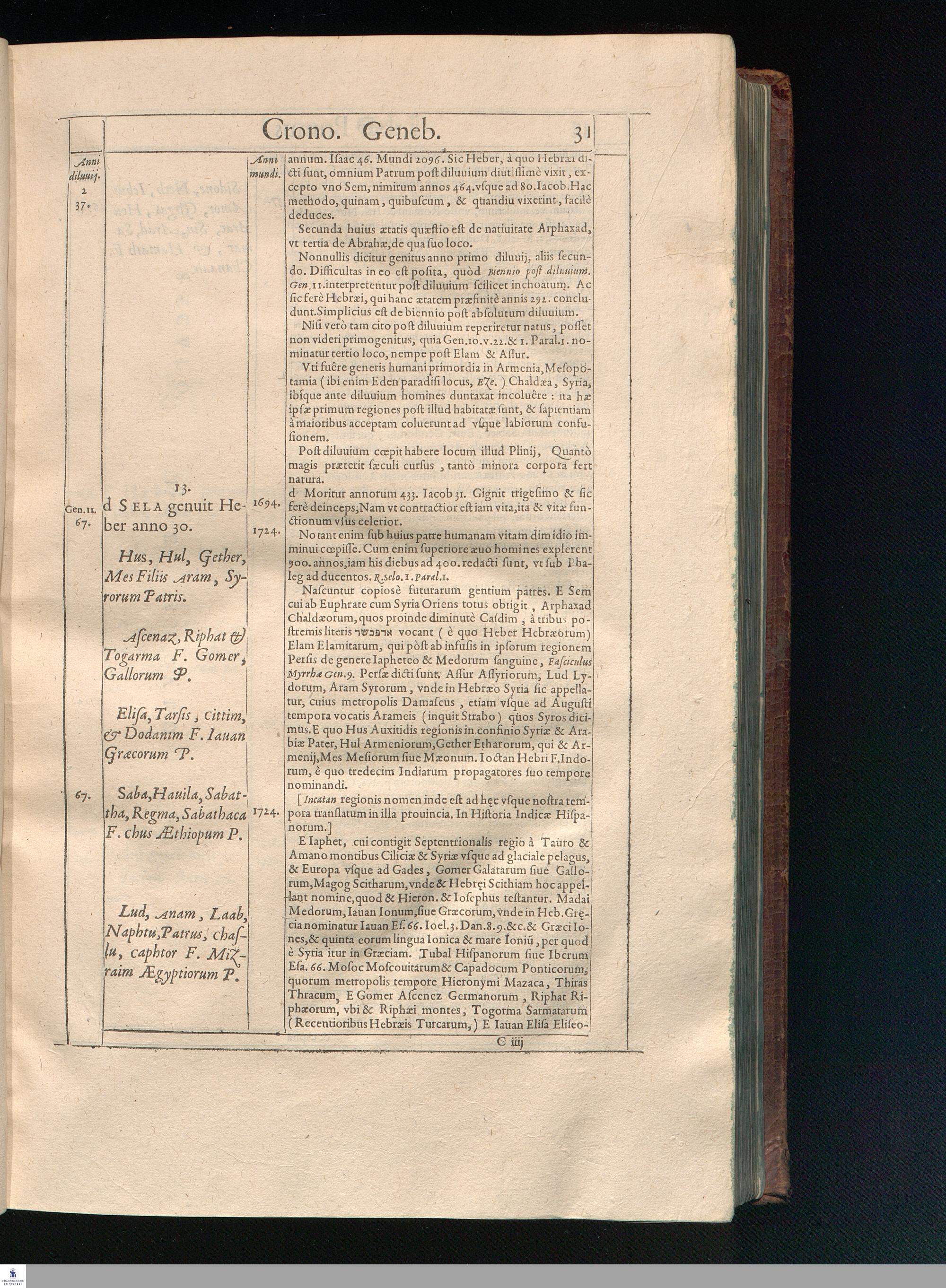 GILB. GENEBRARDI || THEOLOGI PARISIENSIS || DIVINARVM HEBRAICARVMQVE || LITERARVM PROFESSORIS REGII || Chronographiæ Libri quatuor. || PRIORES DVO SVNT DE REBVS VETERIS || populi, & præcipuis quatuor millium annorum gestis. || Posteriores, è D. Arnaldi Pontaci Vasatensis Episcopi Chronographia || aucti, recentes historias reliquorum annorum complectuntur. || Vniuersæ historiæ speculum, in Ecclesiæ præsertim sæculo, à mendaciis, malus, || imposturis Centuriatorum, aliorúmque hæreticorum detersum. || Emendatum, Adauctum etaim, & collocupletatum cum Appendice ad A. D. || M. D C. Iubilæum Maximum & sæcularem. || Per PETRVM VICTOREM PALMAM CAIETANVM I. V. D. & Regium || linguarum Orientalium Lectorem & anagnosten. || Subiuncti sunt libri Hebræorum Chronologici eodem || interprete Genebrardo. ||
