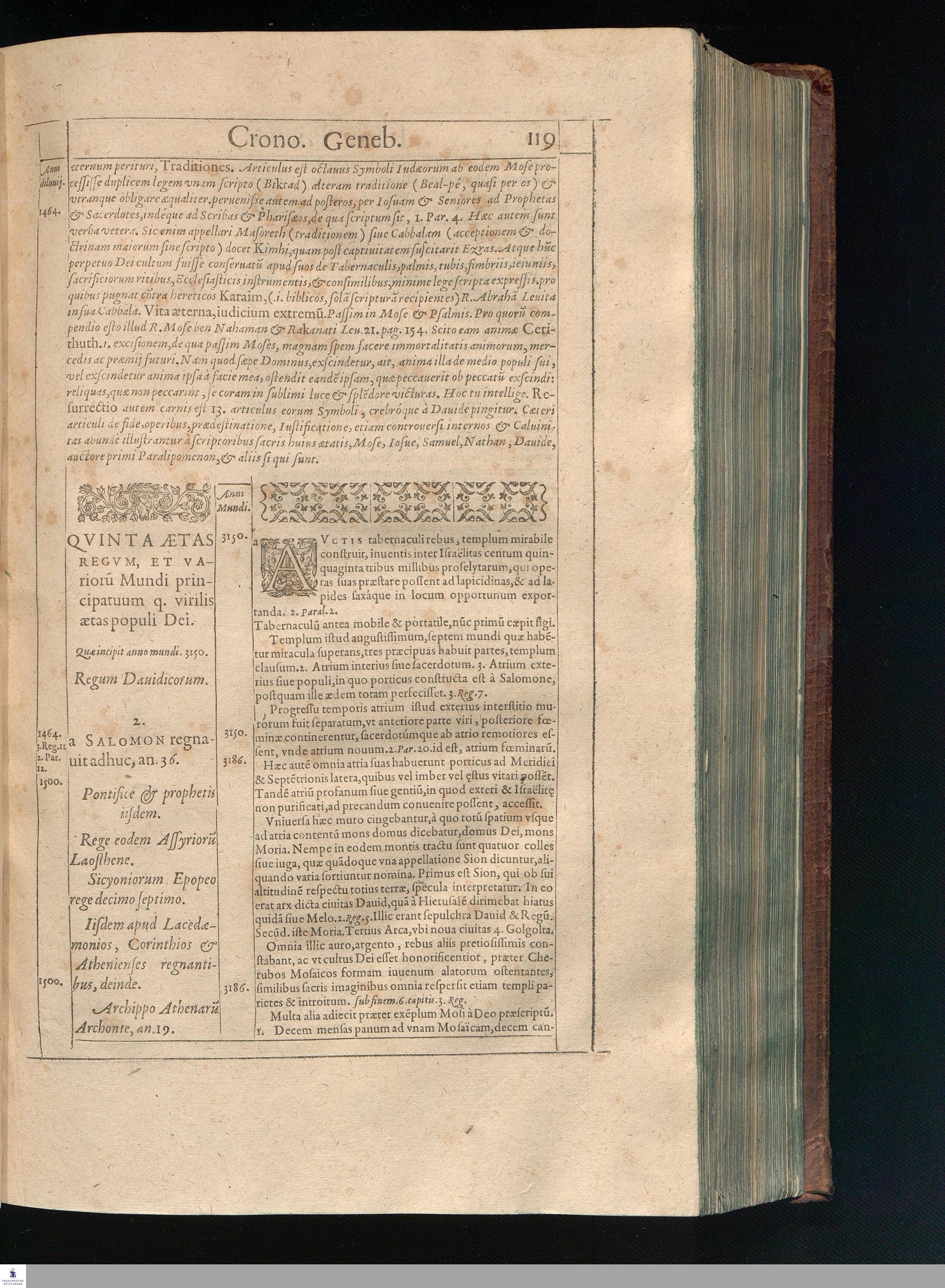 GILB. GENEBRARDI || THEOLOGI PARISIENSIS || DIVINARVM HEBRAICARVMQVE || LITERARVM PROFESSORIS REGII || Chronographiæ Libri quatuor. || PRIORES DVO SVNT DE REBVS VETERIS || populi, & præcipuis quatuor millium annorum gestis. || Posteriores, è D. Arnaldi Pontaci Vasatensis Episcopi Chronographia || aucti, recentes historias reliquorum annorum complectuntur. || Vniuersæ historiæ speculum, in Ecclesiæ præsertim sæculo, à mendaciis, malus, || imposturis Centuriatorum, aliorúmque hæreticorum detersum. || Emendatum, Adauctum etaim, & collocupletatum cum Appendice ad A. D. || M. D C. Iubilæum Maximum & sæcularem. || Per PETRVM VICTOREM PALMAM CAIETANVM I. V. D. & Regium || linguarum Orientalium Lectorem & anagnosten. || Subiuncti sunt libri Hebræorum Chronologici eodem || interprete Genebrardo. ||