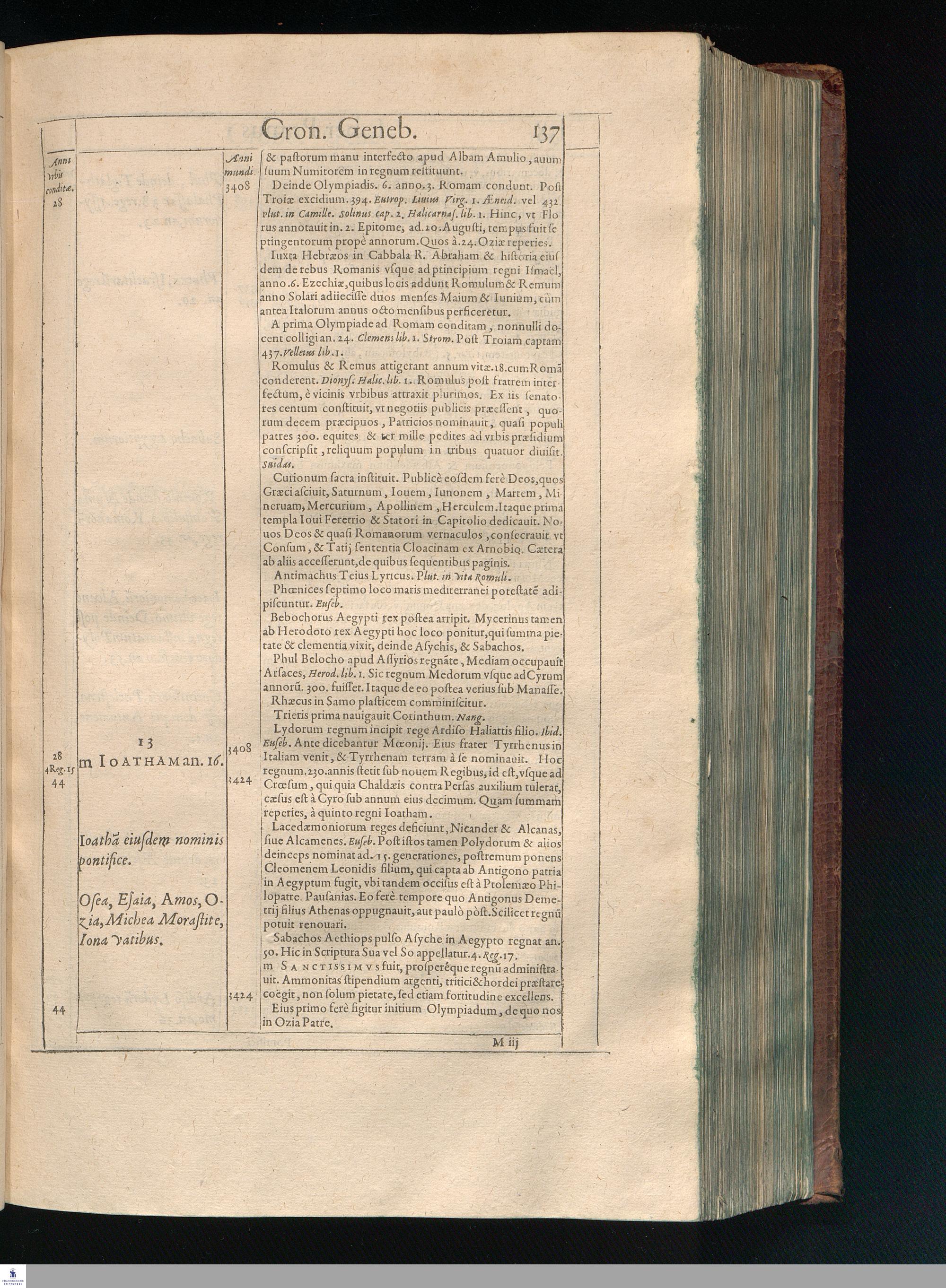 GILB. GENEBRARDI || THEOLOGI PARISIENSIS || DIVINARVM HEBRAICARVMQVE || LITERARVM PROFESSORIS REGII || Chronographiæ Libri quatuor. || PRIORES DVO SVNT DE REBVS VETERIS || populi, & præcipuis quatuor millium annorum gestis. || Posteriores, è D. Arnaldi Pontaci Vasatensis Episcopi Chronographia || aucti, recentes historias reliquorum annorum complectuntur. || Vniuersæ historiæ speculum, in Ecclesiæ præsertim sæculo, à mendaciis, malus, || imposturis Centuriatorum, aliorúmque hæreticorum detersum. || Emendatum, Adauctum etaim, & collocupletatum cum Appendice ad A. D. || M. D C. Iubilæum Maximum & sæcularem. || Per PETRVM VICTOREM PALMAM CAIETANVM I. V. D. & Regium || linguarum Orientalium Lectorem & anagnosten. || Subiuncti sunt libri Hebræorum Chronologici eodem || interprete Genebrardo. ||