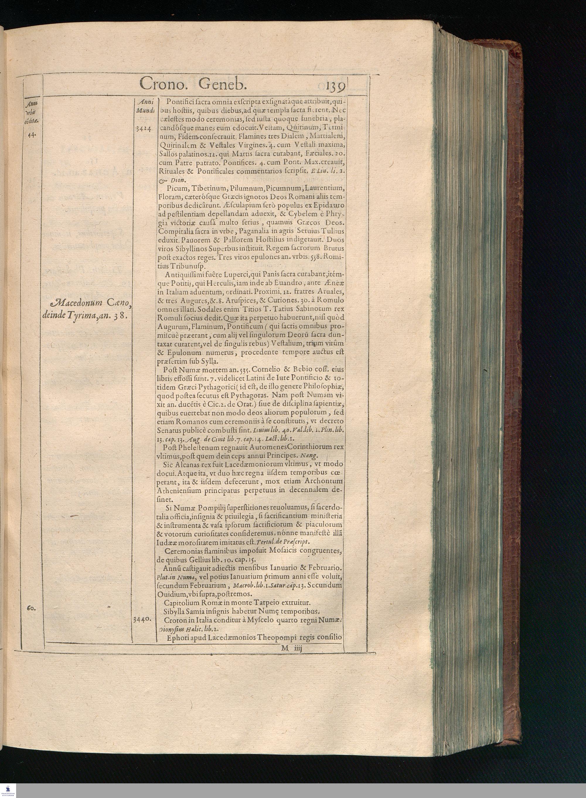 GILB. GENEBRARDI || THEOLOGI PARISIENSIS || DIVINARVM HEBRAICARVMQVE || LITERARVM PROFESSORIS REGII || Chronographiæ Libri quatuor. || PRIORES DVO SVNT DE REBVS VETERIS || populi, & præcipuis quatuor millium annorum gestis. || Posteriores, è D. Arnaldi Pontaci Vasatensis Episcopi Chronographia || aucti, recentes historias reliquorum annorum complectuntur. || Vniuersæ historiæ speculum, in Ecclesiæ præsertim sæculo, à mendaciis, malus, || imposturis Centuriatorum, aliorúmque hæreticorum detersum. || Emendatum, Adauctum etaim, & collocupletatum cum Appendice ad A. D. || M. D C. Iubilæum Maximum & sæcularem. || Per PETRVM VICTOREM PALMAM CAIETANVM I. V. D. & Regium || linguarum Orientalium Lectorem & anagnosten. || Subiuncti sunt libri Hebræorum Chronologici eodem || interprete Genebrardo. ||