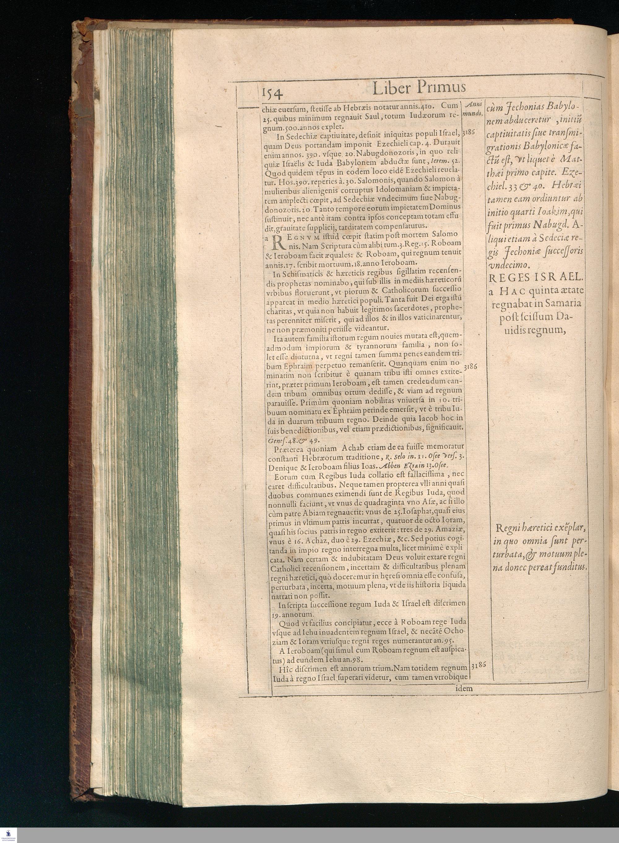 GILB. GENEBRARDI || THEOLOGI PARISIENSIS || DIVINARVM HEBRAICARVMQVE || LITERARVM PROFESSORIS REGII || Chronographiæ Libri quatuor. || PRIORES DVO SVNT DE REBVS VETERIS || populi, & præcipuis quatuor millium annorum gestis. || Posteriores, è D. Arnaldi Pontaci Vasatensis Episcopi Chronographia || aucti, recentes historias reliquorum annorum complectuntur. || Vniuersæ historiæ speculum, in Ecclesiæ præsertim sæculo, à mendaciis, malus, || imposturis Centuriatorum, aliorúmque hæreticorum detersum. || Emendatum, Adauctum etaim, & collocupletatum cum Appendice ad A. D. || M. D C. Iubilæum Maximum & sæcularem. || Per PETRVM VICTOREM PALMAM CAIETANVM I. V. D. & Regium || linguarum Orientalium Lectorem & anagnosten. || Subiuncti sunt libri Hebræorum Chronologici eodem || interprete Genebrardo. ||