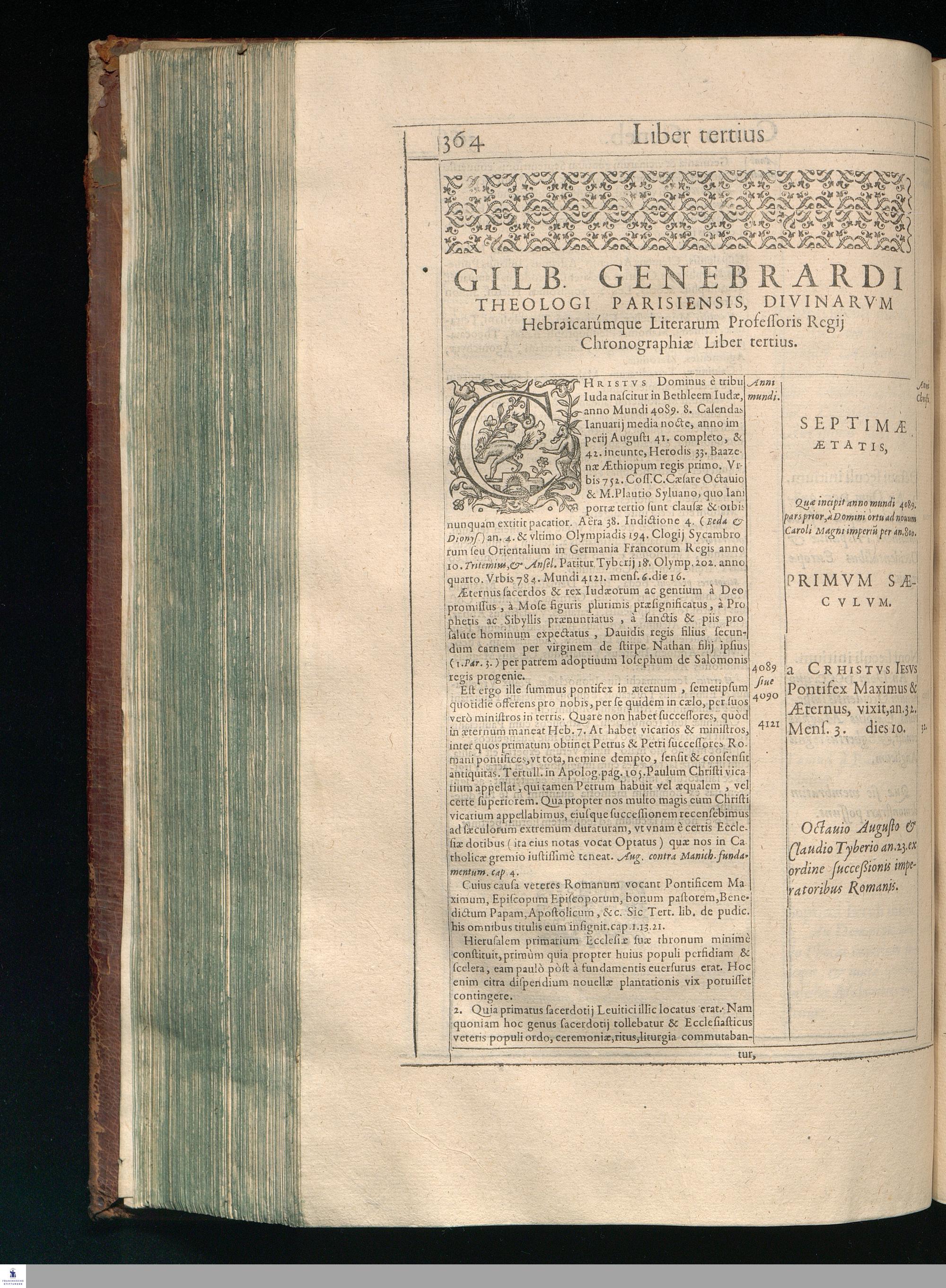 GILB. GENEBRARDI || THEOLOGI PARISIENSIS || DIVINARVM HEBRAICARVMQVE || LITERARVM PROFESSORIS REGII || Chronographiæ Libri quatuor. || PRIORES DVO SVNT DE REBVS VETERIS || populi, & præcipuis quatuor millium annorum gestis. || Posteriores, è D. Arnaldi Pontaci Vasatensis Episcopi Chronographia || aucti, recentes historias reliquorum annorum complectuntur. || Vniuersæ historiæ speculum, in Ecclesiæ præsertim sæculo, à mendaciis, malus, || imposturis Centuriatorum, aliorúmque hæreticorum detersum. || Emendatum, Adauctum etaim, & collocupletatum cum Appendice ad A. D. || M. D C. Iubilæum Maximum & sæcularem. || Per PETRVM VICTOREM PALMAM CAIETANVM I. V. D. & Regium || linguarum Orientalium Lectorem & anagnosten. || Subiuncti sunt libri Hebræorum Chronologici eodem || interprete Genebrardo. ||