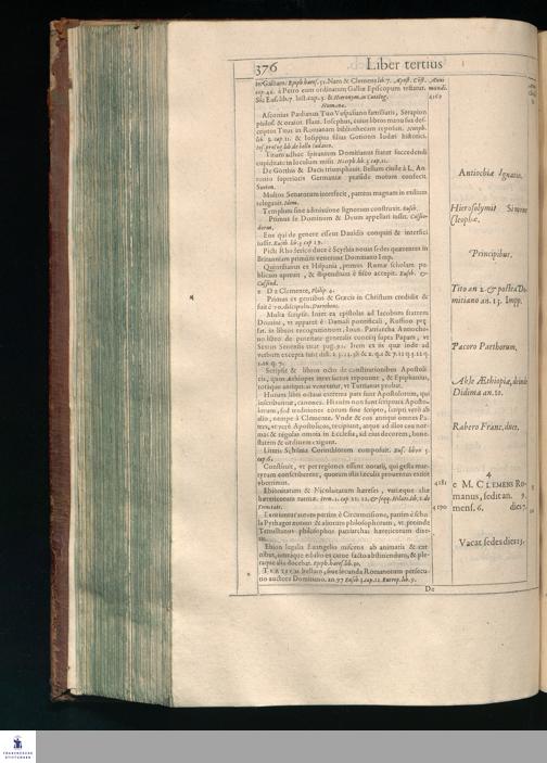 GILB. GENEBRARDI || THEOLOGI PARISIENSIS || DIVINARVM HEBRAICARVMQVE || LITERARVM PROFESSORIS REGII || Chronographiæ Libri quatuor. || PRIORES DVO SVNT DE REBVS VETERIS || populi, & præcipuis quatuor millium annorum gestis. || Posteriores, è D. Arnaldi Pontaci Vasatensis Episcopi Chronographia || aucti, recentes historias reliquorum annorum complectuntur. || Vniuersæ historiæ speculum, in Ecclesiæ præsertim sæculo, à mendaciis, malus, || imposturis Centuriatorum, aliorúmque hæreticorum detersum. || Emendatum, Adauctum etaim, & collocupletatum cum Appendice ad A. D. || M. D C. Iubilæum Maximum & sæcularem. || Per PETRVM VICTOREM PALMAM CAIETANVM I. V. D. & Regium || linguarum Orientalium Lectorem & anagnosten. || Subiuncti sunt libri Hebræorum Chronologici eodem || interprete Genebrardo. ||