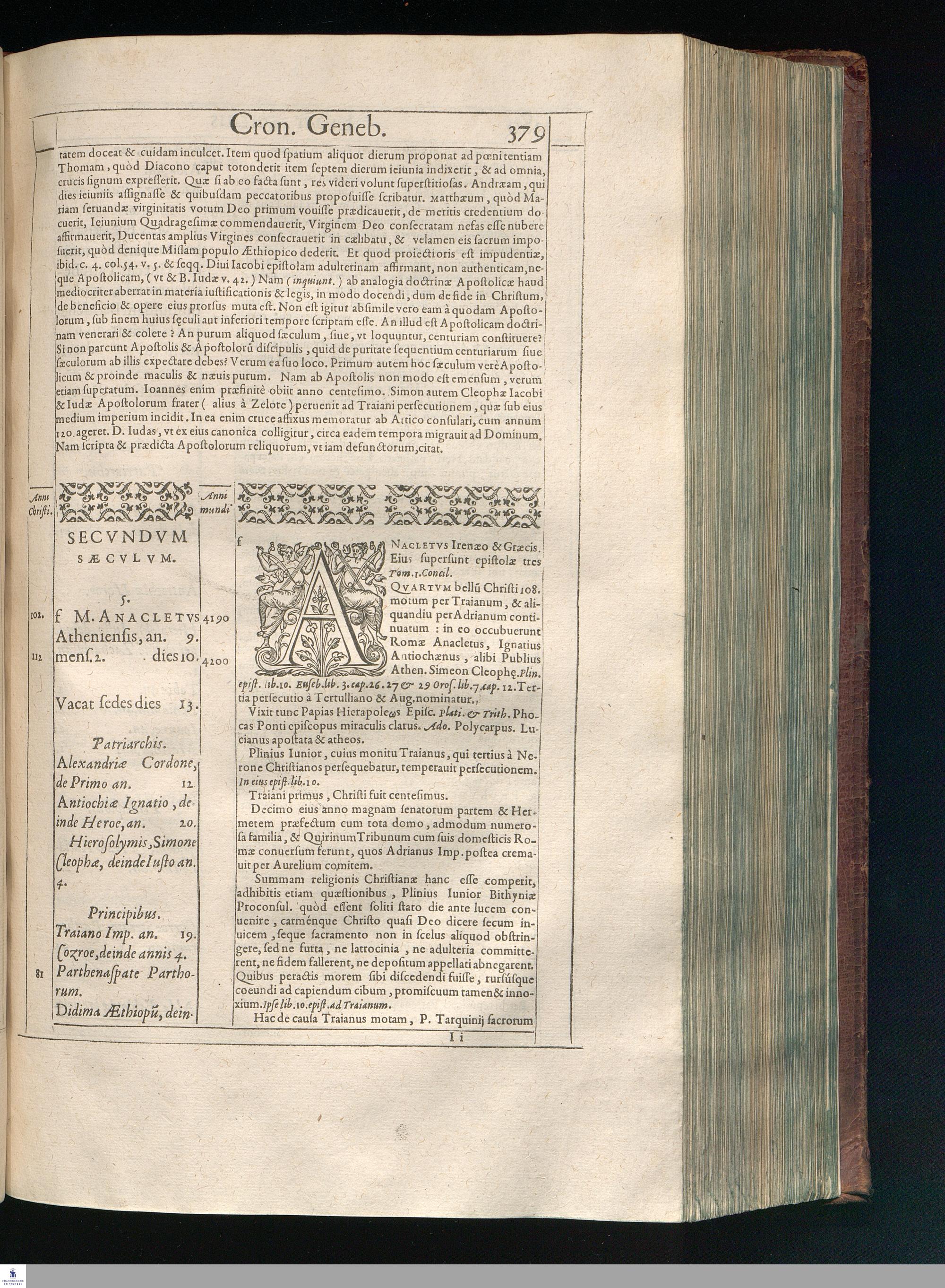 GILB. GENEBRARDI || THEOLOGI PARISIENSIS || DIVINARVM HEBRAICARVMQVE || LITERARVM PROFESSORIS REGII || Chronographiæ Libri quatuor. || PRIORES DVO SVNT DE REBVS VETERIS || populi, & præcipuis quatuor millium annorum gestis. || Posteriores, è D. Arnaldi Pontaci Vasatensis Episcopi Chronographia || aucti, recentes historias reliquorum annorum complectuntur. || Vniuersæ historiæ speculum, in Ecclesiæ præsertim sæculo, à mendaciis, malus, || imposturis Centuriatorum, aliorúmque hæreticorum detersum. || Emendatum, Adauctum etaim, & collocupletatum cum Appendice ad A. D. || M. D C. Iubilæum Maximum & sæcularem. || Per PETRVM VICTOREM PALMAM CAIETANVM I. V. D. & Regium || linguarum Orientalium Lectorem & anagnosten. || Subiuncti sunt libri Hebræorum Chronologici eodem || interprete Genebrardo. ||