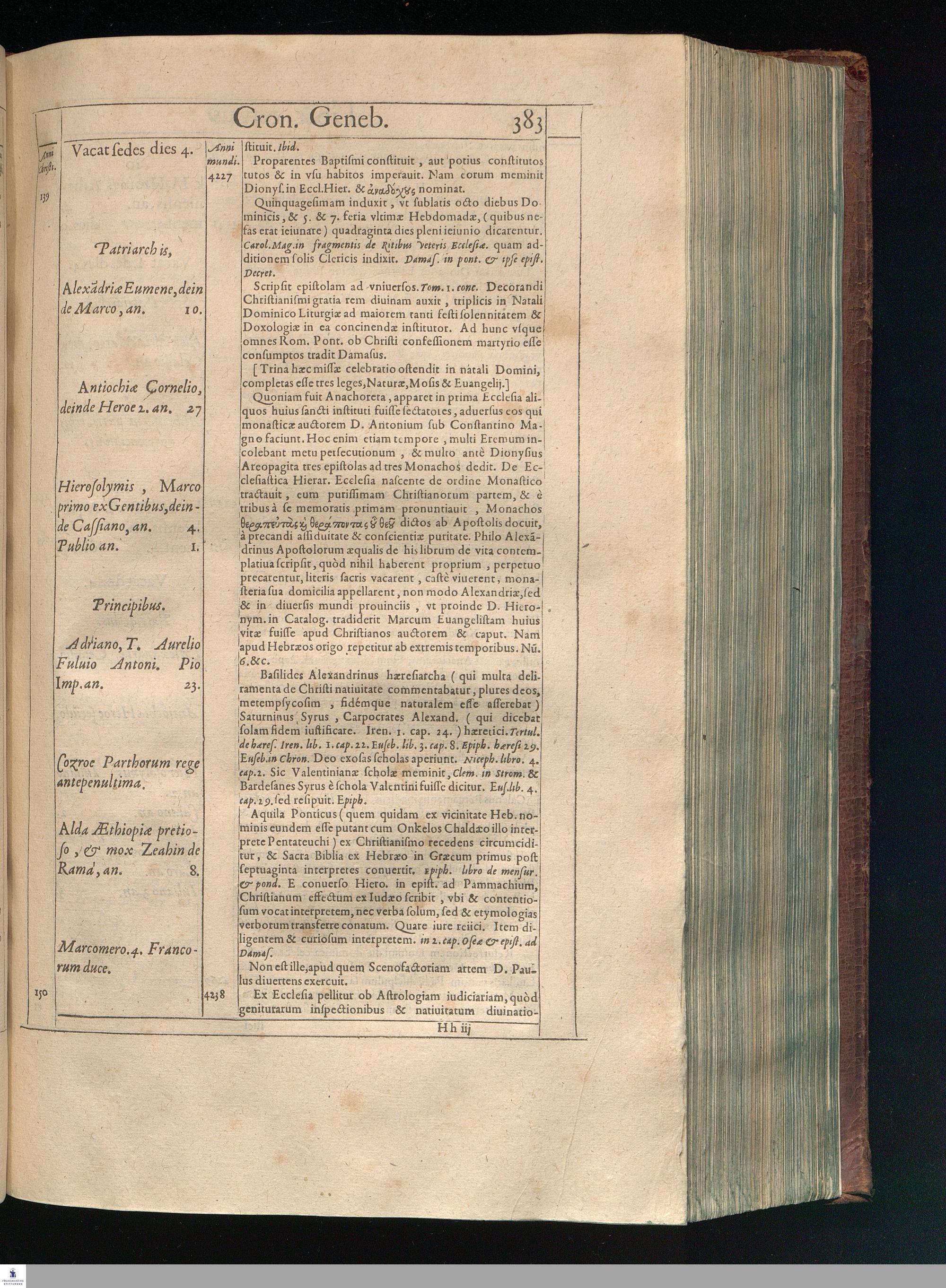 GILB. GENEBRARDI || THEOLOGI PARISIENSIS || DIVINARVM HEBRAICARVMQVE || LITERARVM PROFESSORIS REGII || Chronographiæ Libri quatuor. || PRIORES DVO SVNT DE REBVS VETERIS || populi, & præcipuis quatuor millium annorum gestis. || Posteriores, è D. Arnaldi Pontaci Vasatensis Episcopi Chronographia || aucti, recentes historias reliquorum annorum complectuntur. || Vniuersæ historiæ speculum, in Ecclesiæ præsertim sæculo, à mendaciis, malus, || imposturis Centuriatorum, aliorúmque hæreticorum detersum. || Emendatum, Adauctum etaim, & collocupletatum cum Appendice ad A. D. || M. D C. Iubilæum Maximum & sæcularem. || Per PETRVM VICTOREM PALMAM CAIETANVM I. V. D. & Regium || linguarum Orientalium Lectorem & anagnosten. || Subiuncti sunt libri Hebræorum Chronologici eodem || interprete Genebrardo. ||