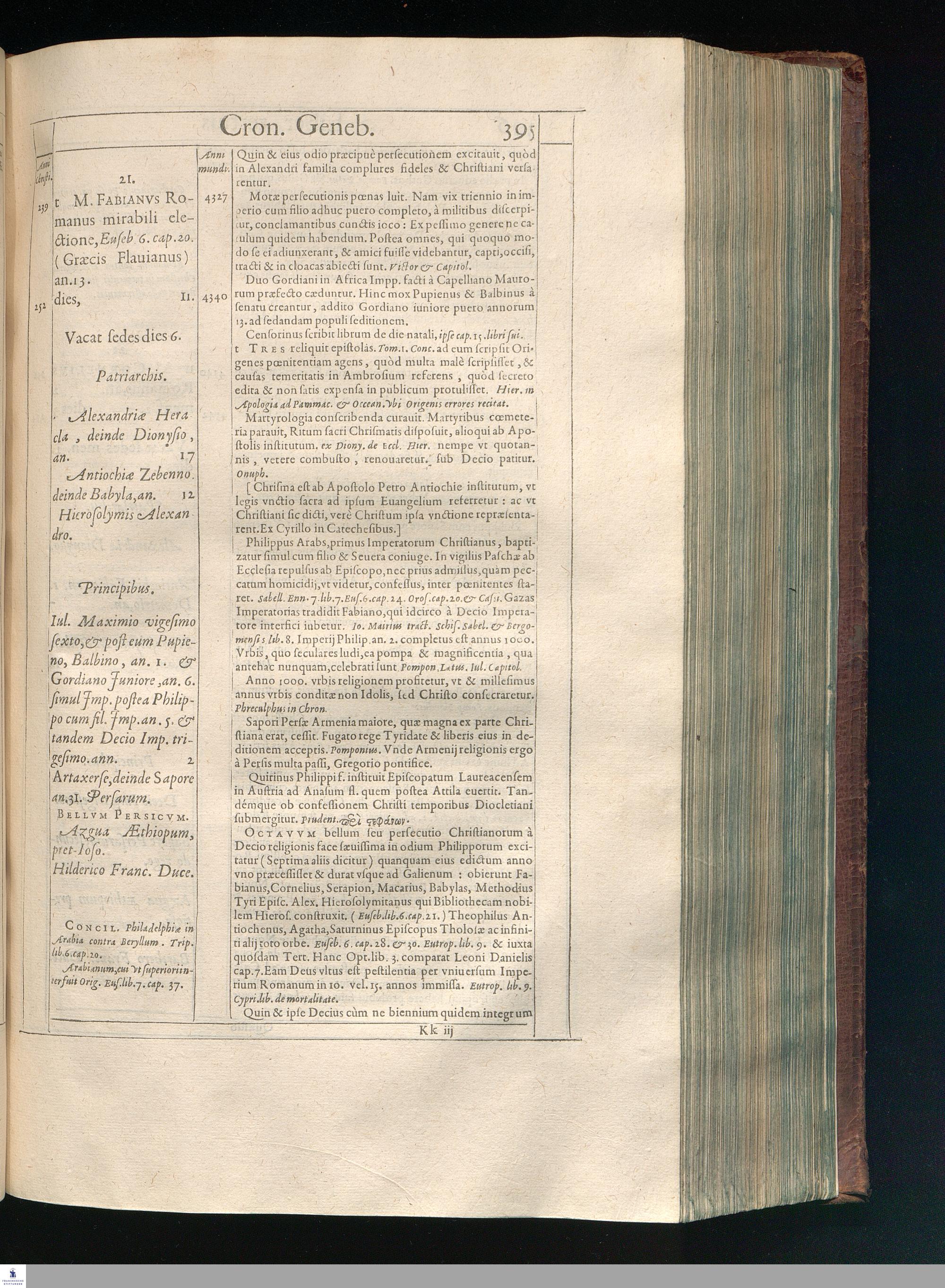 GILB. GENEBRARDI || THEOLOGI PARISIENSIS || DIVINARVM HEBRAICARVMQVE || LITERARVM PROFESSORIS REGII || Chronographiæ Libri quatuor. || PRIORES DVO SVNT DE REBVS VETERIS || populi, & præcipuis quatuor millium annorum gestis. || Posteriores, è D. Arnaldi Pontaci Vasatensis Episcopi Chronographia || aucti, recentes historias reliquorum annorum complectuntur. || Vniuersæ historiæ speculum, in Ecclesiæ præsertim sæculo, à mendaciis, malus, || imposturis Centuriatorum, aliorúmque hæreticorum detersum. || Emendatum, Adauctum etaim, & collocupletatum cum Appendice ad A. D. || M. D C. Iubilæum Maximum & sæcularem. || Per PETRVM VICTOREM PALMAM CAIETANVM I. V. D. & Regium || linguarum Orientalium Lectorem & anagnosten. || Subiuncti sunt libri Hebræorum Chronologici eodem || interprete Genebrardo. ||