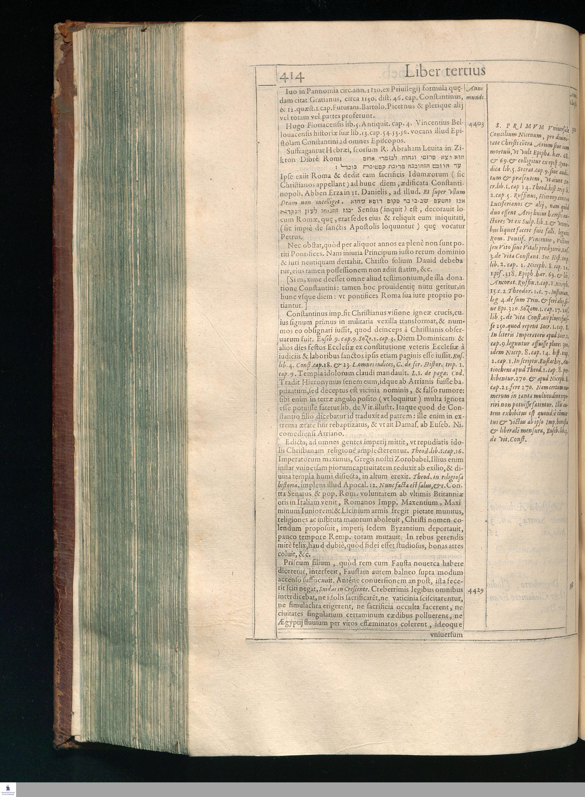 GILB. GENEBRARDI || THEOLOGI PARISIENSIS || DIVINARVM HEBRAICARVMQVE || LITERARVM PROFESSORIS REGII || Chronographiæ Libri quatuor. || PRIORES DVO SVNT DE REBVS VETERIS || populi, & præcipuis quatuor millium annorum gestis. || Posteriores, è D. Arnaldi Pontaci Vasatensis Episcopi Chronographia || aucti, recentes historias reliquorum annorum complectuntur. || Vniuersæ historiæ speculum, in Ecclesiæ præsertim sæculo, à mendaciis, malus, || imposturis Centuriatorum, aliorúmque hæreticorum detersum. || Emendatum, Adauctum etaim, & collocupletatum cum Appendice ad A. D. || M. D C. Iubilæum Maximum & sæcularem. || Per PETRVM VICTOREM PALMAM CAIETANVM I. V. D. & Regium || linguarum Orientalium Lectorem & anagnosten. || Subiuncti sunt libri Hebræorum Chronologici eodem || interprete Genebrardo. ||