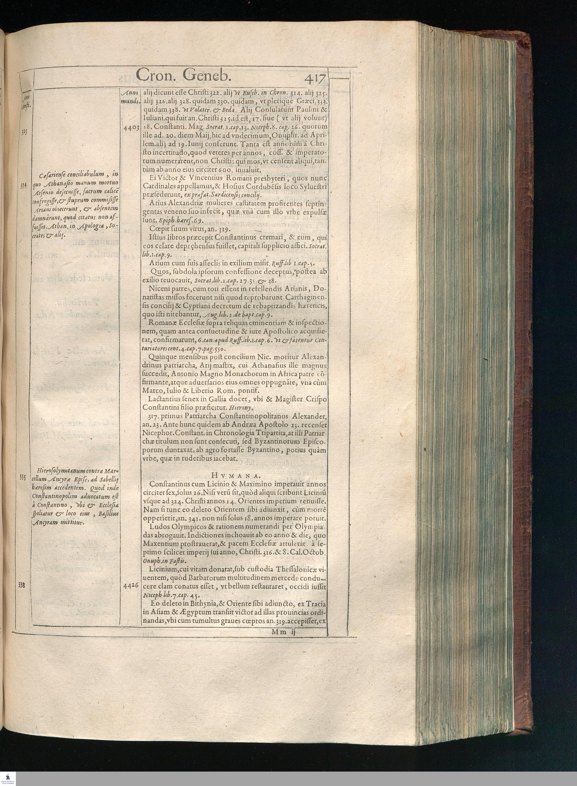 GILB. GENEBRARDI || THEOLOGI PARISIENSIS || DIVINARVM HEBRAICARVMQVE || LITERARVM PROFESSORIS REGII || Chronographiæ Libri quatuor. || PRIORES DVO SVNT DE REBVS VETERIS || populi, & præcipuis quatuor millium annorum gestis. || Posteriores, è D. Arnaldi Pontaci Vasatensis Episcopi Chronographia || aucti, recentes historias reliquorum annorum complectuntur. || Vniuersæ historiæ speculum, in Ecclesiæ præsertim sæculo, à mendaciis, malus, || imposturis Centuriatorum, aliorúmque hæreticorum detersum. || Emendatum, Adauctum etaim, & collocupletatum cum Appendice ad A. D. || M. D C. Iubilæum Maximum & sæcularem. || Per PETRVM VICTOREM PALMAM CAIETANVM I. V. D. & Regium || linguarum Orientalium Lectorem & anagnosten. || Subiuncti sunt libri Hebræorum Chronologici eodem || interprete Genebrardo. ||