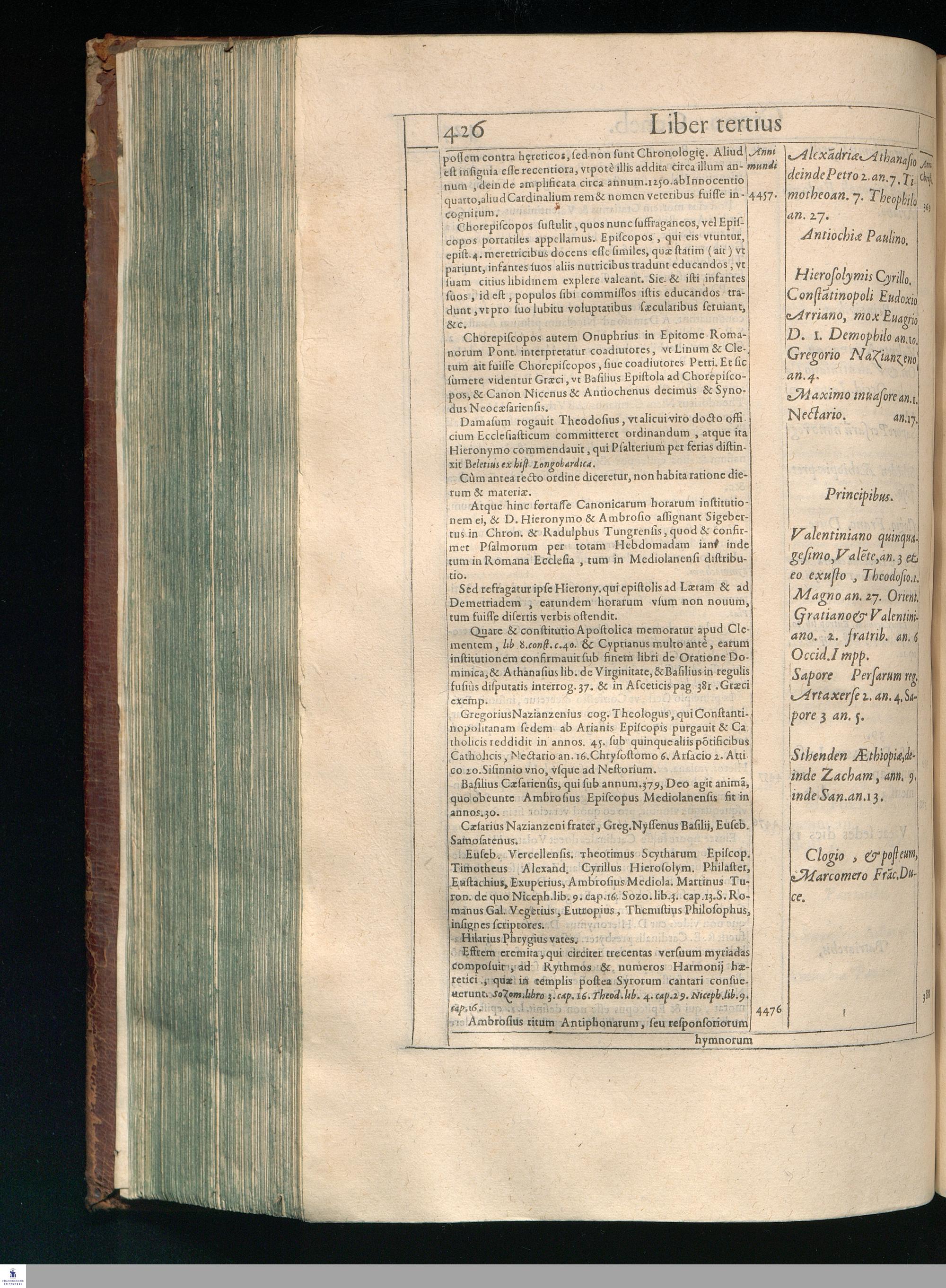 GILB. GENEBRARDI || THEOLOGI PARISIENSIS || DIVINARVM HEBRAICARVMQVE || LITERARVM PROFESSORIS REGII || Chronographiæ Libri quatuor. || PRIORES DVO SVNT DE REBVS VETERIS || populi, & præcipuis quatuor millium annorum gestis. || Posteriores, è D. Arnaldi Pontaci Vasatensis Episcopi Chronographia || aucti, recentes historias reliquorum annorum complectuntur. || Vniuersæ historiæ speculum, in Ecclesiæ præsertim sæculo, à mendaciis, malus, || imposturis Centuriatorum, aliorúmque hæreticorum detersum. || Emendatum, Adauctum etaim, & collocupletatum cum Appendice ad A. D. || M. D C. Iubilæum Maximum & sæcularem. || Per PETRVM VICTOREM PALMAM CAIETANVM I. V. D. & Regium || linguarum Orientalium Lectorem & anagnosten. || Subiuncti sunt libri Hebræorum Chronologici eodem || interprete Genebrardo. ||