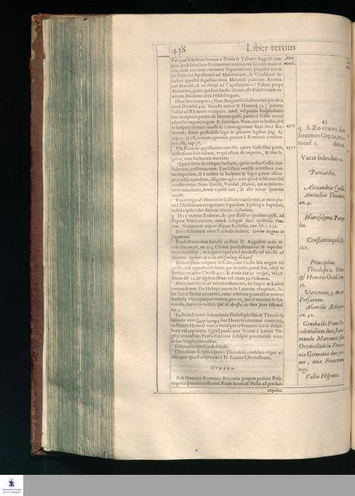 GILB. GENEBRARDI || THEOLOGI PARISIENSIS || DIVINARVM HEBRAICARVMQVE || LITERARVM PROFESSORIS REGII || Chronographiæ Libri quatuor. || PRIORES DVO SVNT DE REBVS VETERIS || populi, & præcipuis quatuor millium annorum gestis. || Posteriores, è D. Arnaldi Pontaci Vasatensis Episcopi Chronographia || aucti, recentes historias reliquorum annorum complectuntur. || Vniuersæ historiæ speculum, in Ecclesiæ præsertim sæculo, à mendaciis, malus, || imposturis Centuriatorum, aliorúmque hæreticorum detersum. || Emendatum, Adauctum etaim, & collocupletatum cum Appendice ad A. D. || M. D C. Iubilæum Maximum & sæcularem. || Per PETRVM VICTOREM PALMAM CAIETANVM I. V. D. & Regium || linguarum Orientalium Lectorem & anagnosten. || Subiuncti sunt libri Hebræorum Chronologici eodem || interprete Genebrardo. ||