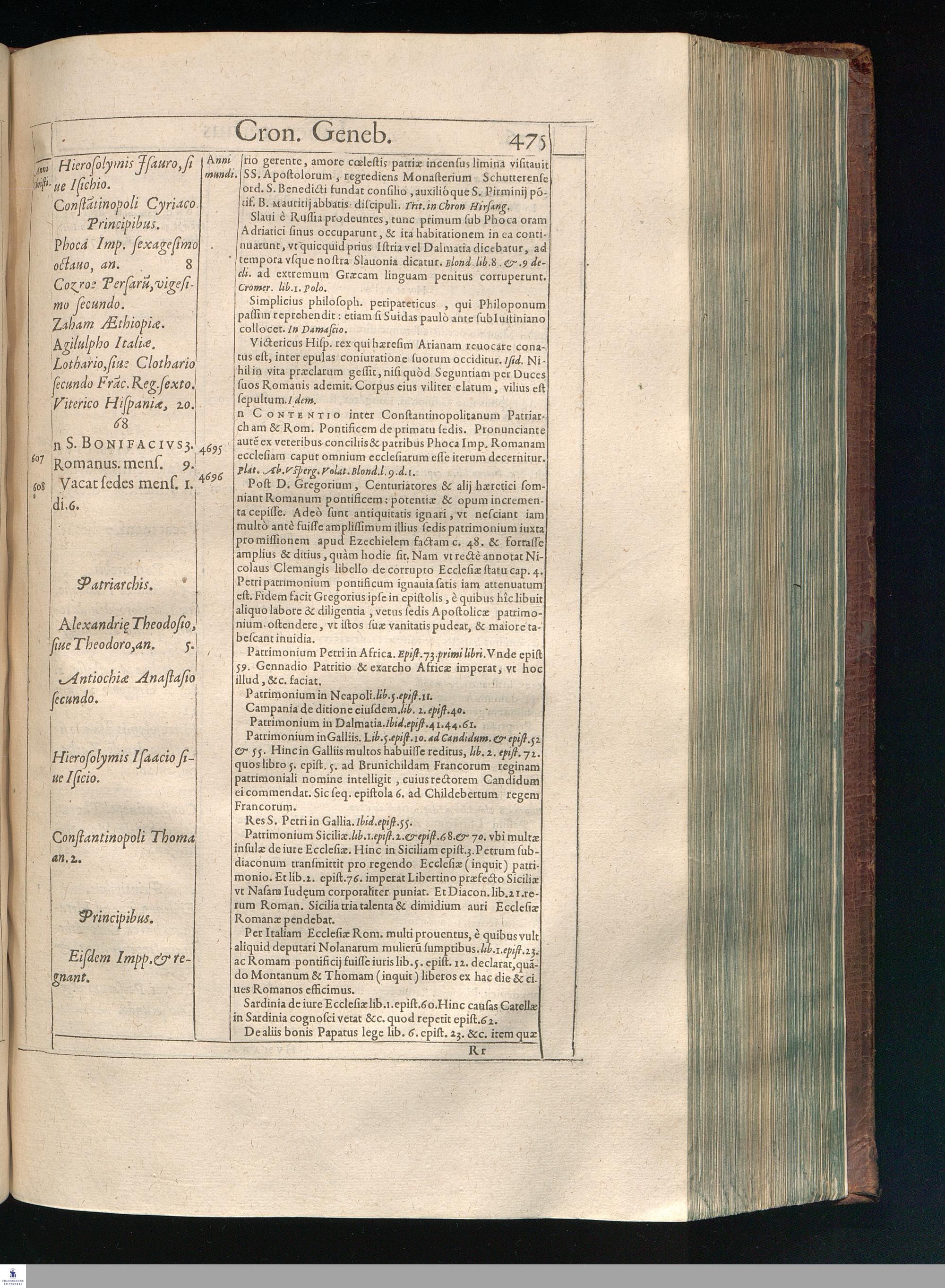 GILB. GENEBRARDI || THEOLOGI PARISIENSIS || DIVINARVM HEBRAICARVMQVE || LITERARVM PROFESSORIS REGII || Chronographiæ Libri quatuor. || PRIORES DVO SVNT DE REBVS VETERIS || populi, & præcipuis quatuor millium annorum gestis. || Posteriores, è D. Arnaldi Pontaci Vasatensis Episcopi Chronographia || aucti, recentes historias reliquorum annorum complectuntur. || Vniuersæ historiæ speculum, in Ecclesiæ præsertim sæculo, à mendaciis, malus, || imposturis Centuriatorum, aliorúmque hæreticorum detersum. || Emendatum, Adauctum etaim, & collocupletatum cum Appendice ad A. D. || M. D C. Iubilæum Maximum & sæcularem. || Per PETRVM VICTOREM PALMAM CAIETANVM I. V. D. & Regium || linguarum Orientalium Lectorem & anagnosten. || Subiuncti sunt libri Hebræorum Chronologici eodem || interprete Genebrardo. ||