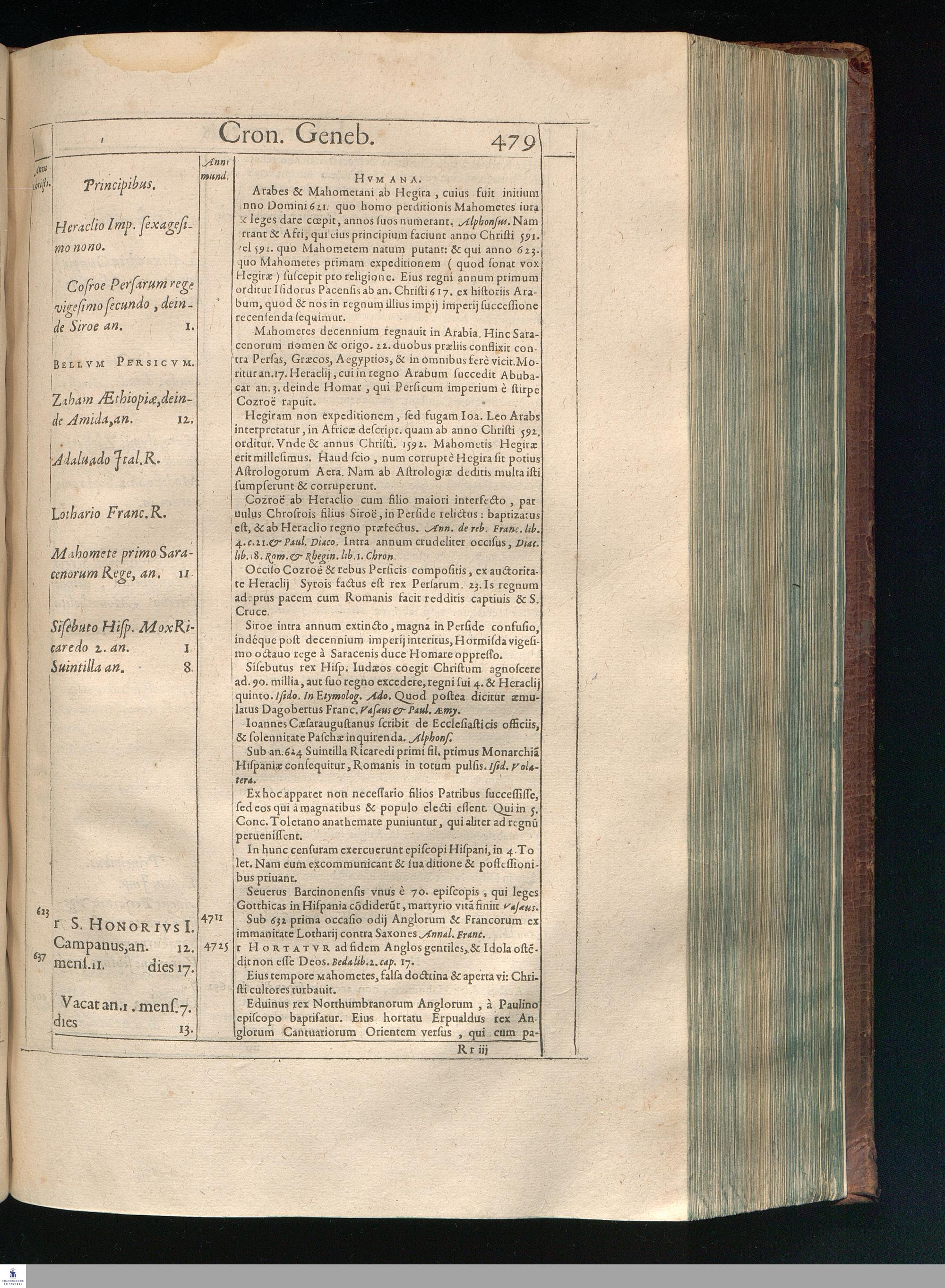GILB. GENEBRARDI || THEOLOGI PARISIENSIS || DIVINARVM HEBRAICARVMQVE || LITERARVM PROFESSORIS REGII || Chronographiæ Libri quatuor. || PRIORES DVO SVNT DE REBVS VETERIS || populi, & præcipuis quatuor millium annorum gestis. || Posteriores, è D. Arnaldi Pontaci Vasatensis Episcopi Chronographia || aucti, recentes historias reliquorum annorum complectuntur. || Vniuersæ historiæ speculum, in Ecclesiæ præsertim sæculo, à mendaciis, malus, || imposturis Centuriatorum, aliorúmque hæreticorum detersum. || Emendatum, Adauctum etaim, & collocupletatum cum Appendice ad A. D. || M. D C. Iubilæum Maximum & sæcularem. || Per PETRVM VICTOREM PALMAM CAIETANVM I. V. D. & Regium || linguarum Orientalium Lectorem & anagnosten. || Subiuncti sunt libri Hebræorum Chronologici eodem || interprete Genebrardo. ||