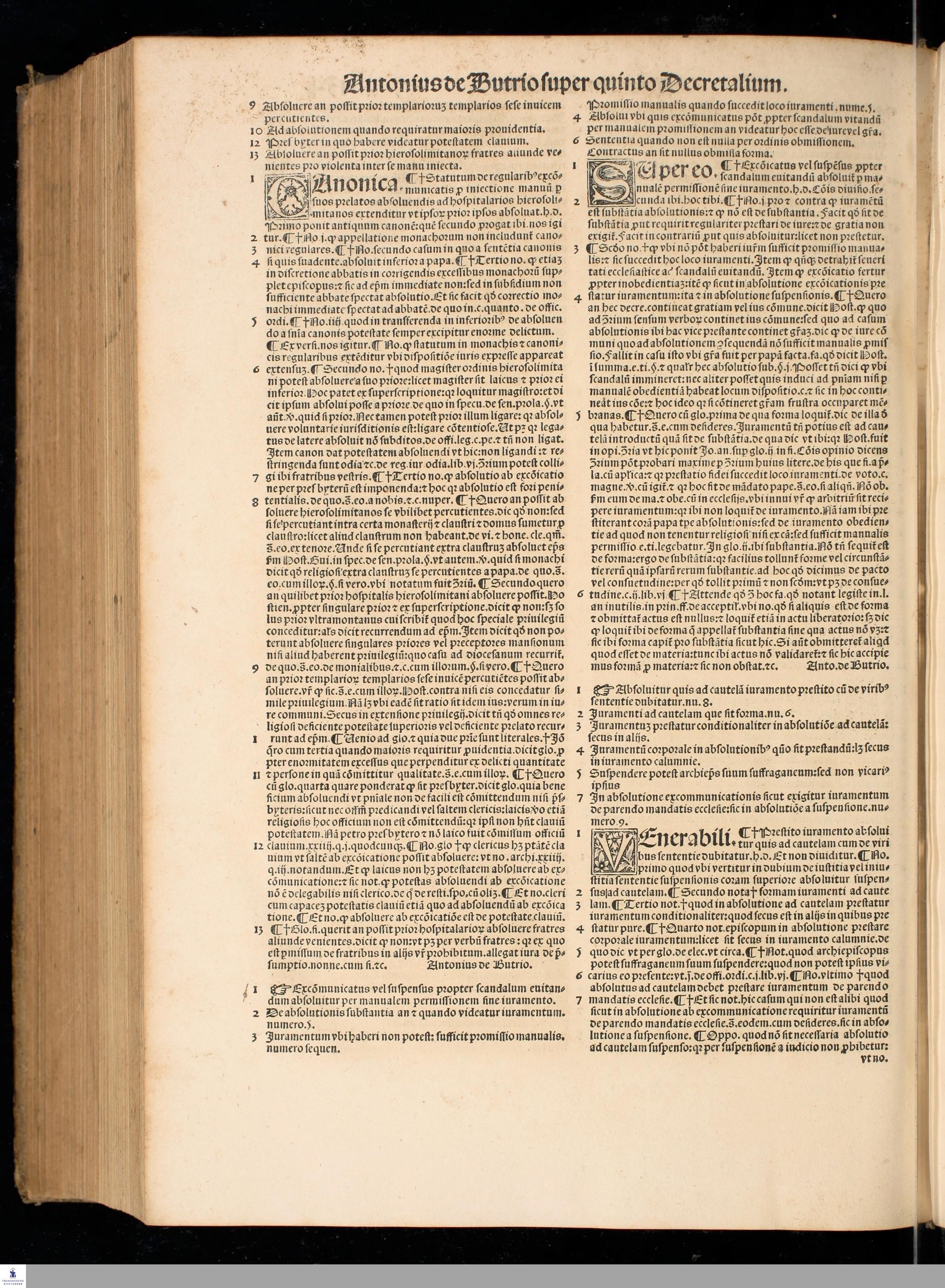 P. 5 (1532) ... || SVPER QVINTO DECRE=||TALIVM. || CLARISSIMI IVRIS || VTRIVSQVE DOCTORIS DOMINI || Antonij de Butrio super Quinto Decre=||talium accuratissime excusa, ... || ... ||