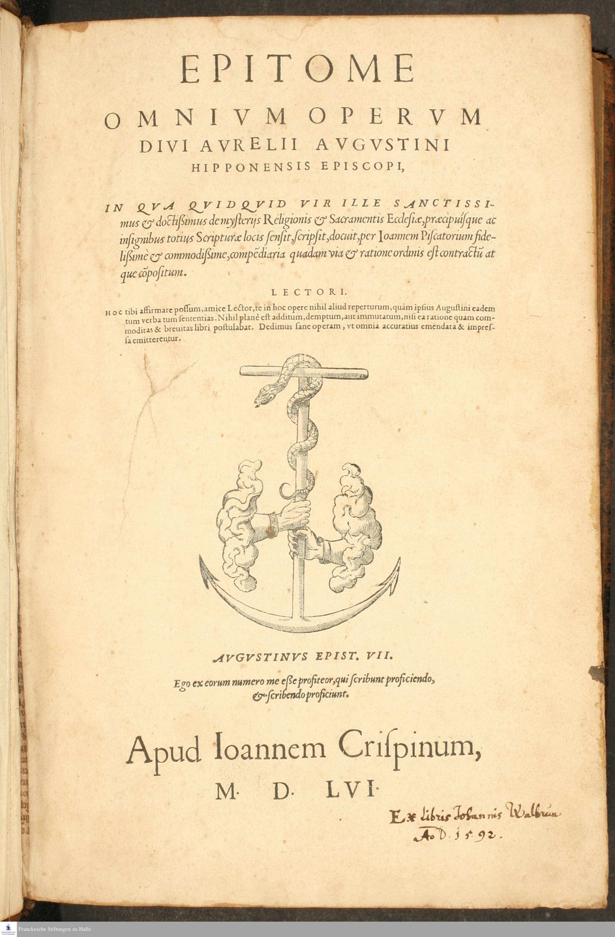 EPITOME || OMNIVM OPERVM || DIVI AVRELII AVGVSTINI || HIPPONENSIS EPISCOPI, || IN QVA QVIDQVID VIR ILLE SANCTISSI-||mus & doctißimus demysterijs Religionis & Sacramentis Ecclesiæ, præcipuísque ac || insignibus totius Scripturæ locis sensit, scripsit, docuit, per Ioannem Piscatorium fide-||lißimè & commodißime, compe[n]diaria quadam via & ratione ordinis est contractu[m] at||que co[m]positum. || ... ||