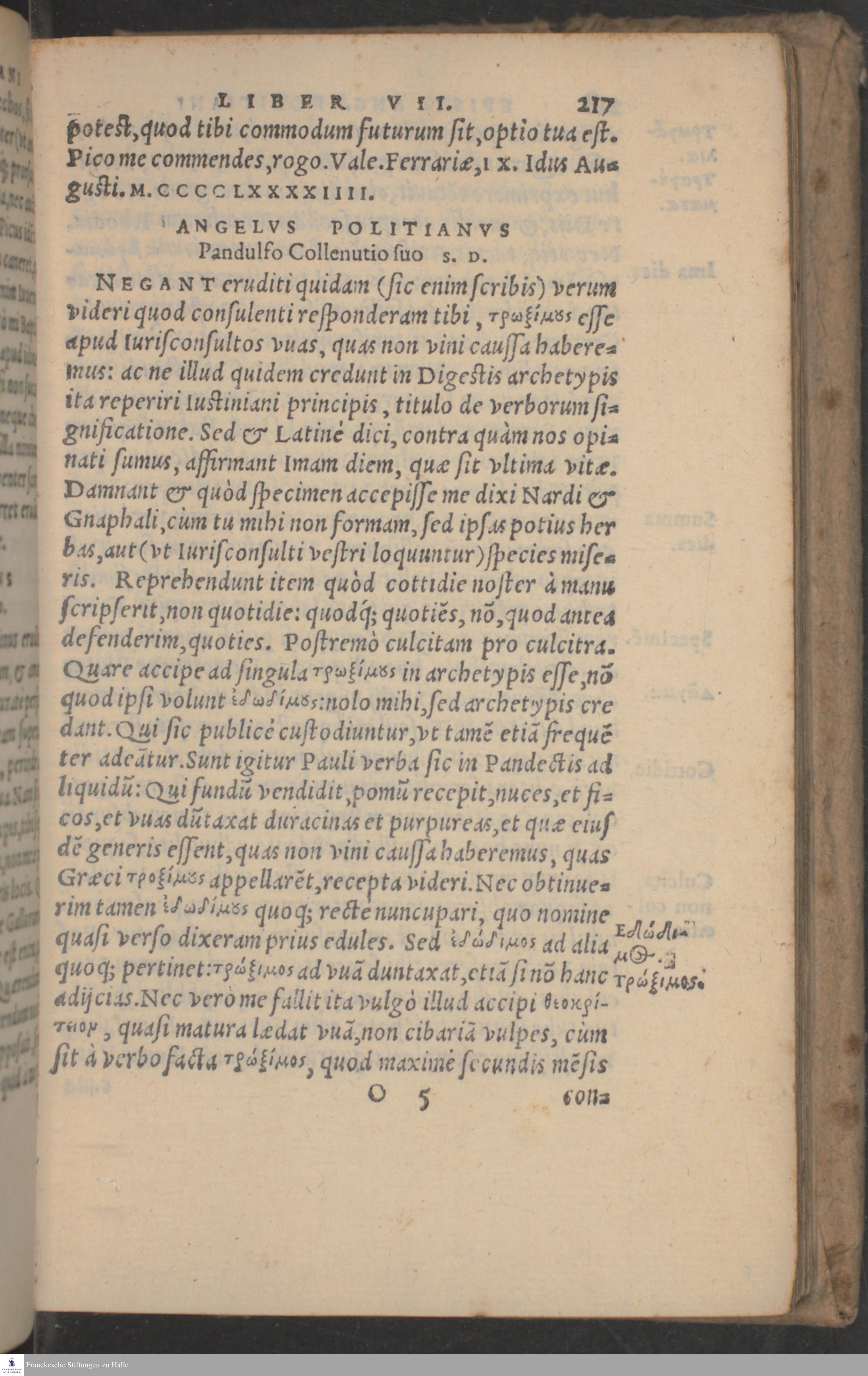 T. 1 (1565) ANGELI || POLITIANI || OPERVM || TOMVS PRIMVS. || Epistolarum libros XII. ac Miscellaneorum || Centuriam I. complectens. || Indicem rerum memorabilium calci || operis adiecimus. ||