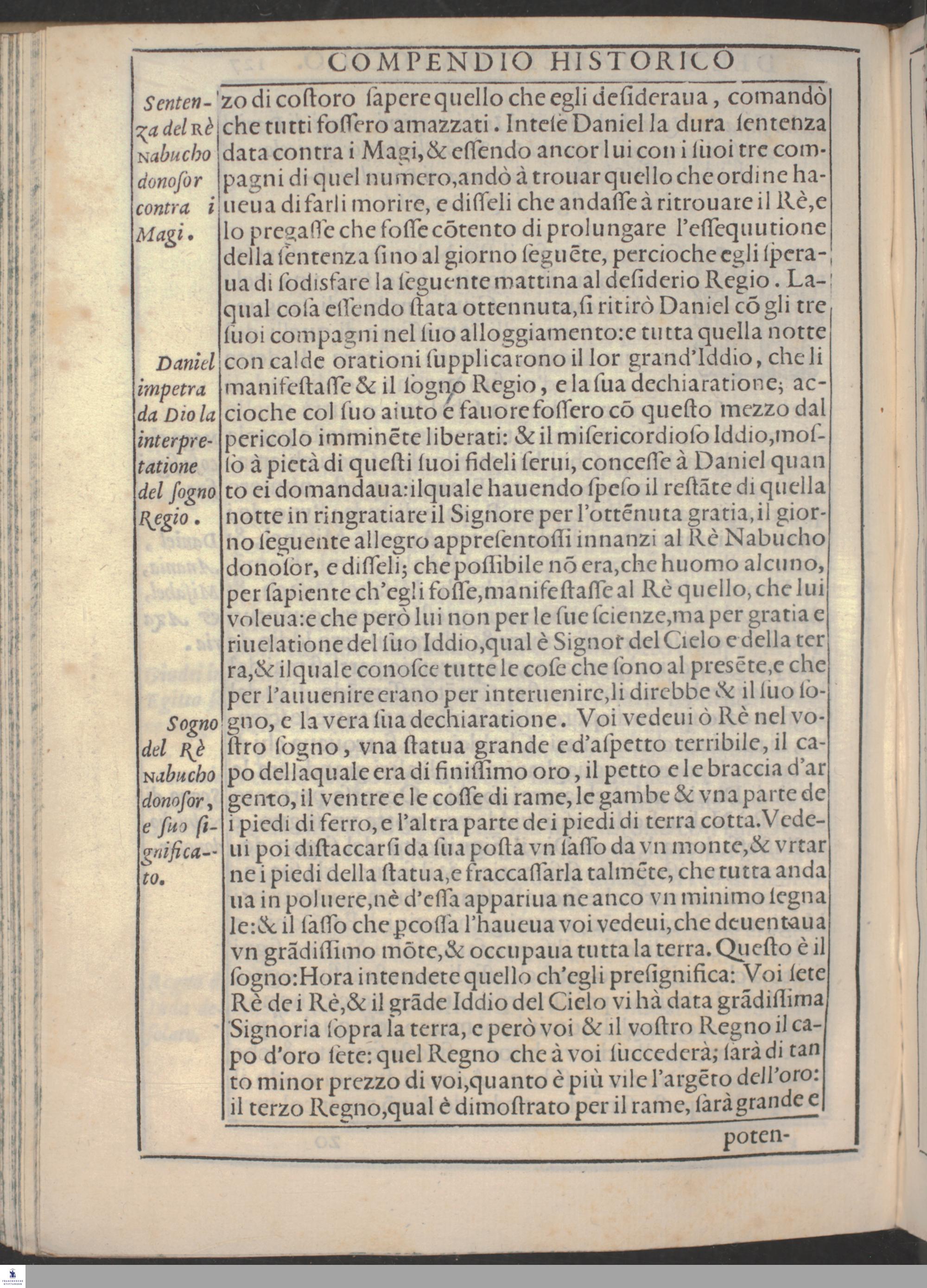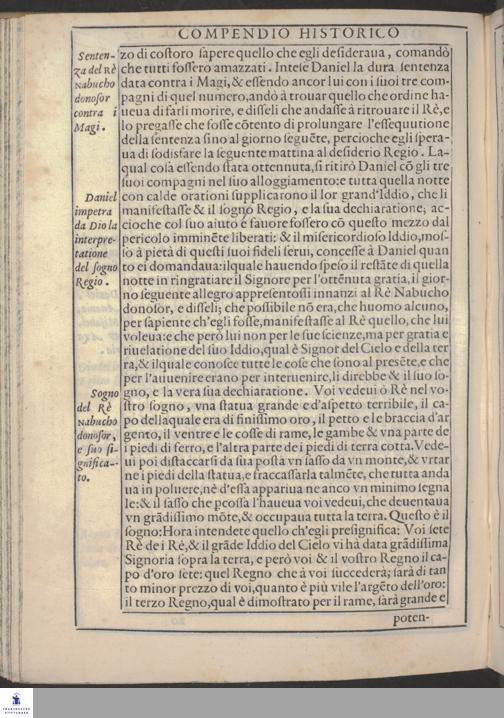 COMPENDIO || HISTORICO || Del Vecchio, e del Nuovo Testamento: || CAVATO DALLA || SACRA BIBBIA, || Da Don Bartolomeo Dionigi da Fano. || Nelquale si descriueno tutte le cose notabili, che successero nel || popolo Hebreo, dalla Creatione del Mondo, sino alla || vltima destruttione di Ierusalem. || Con la vita di Giesv Christo, Saluator del Mondo, & con la disse-||minatione dell'Euangelio, e della sua santa Fede. || Et con due Tauole, l'vna delli Capitoli, l'altra delle cose notabili. || CON PRIVILEGIO. ||