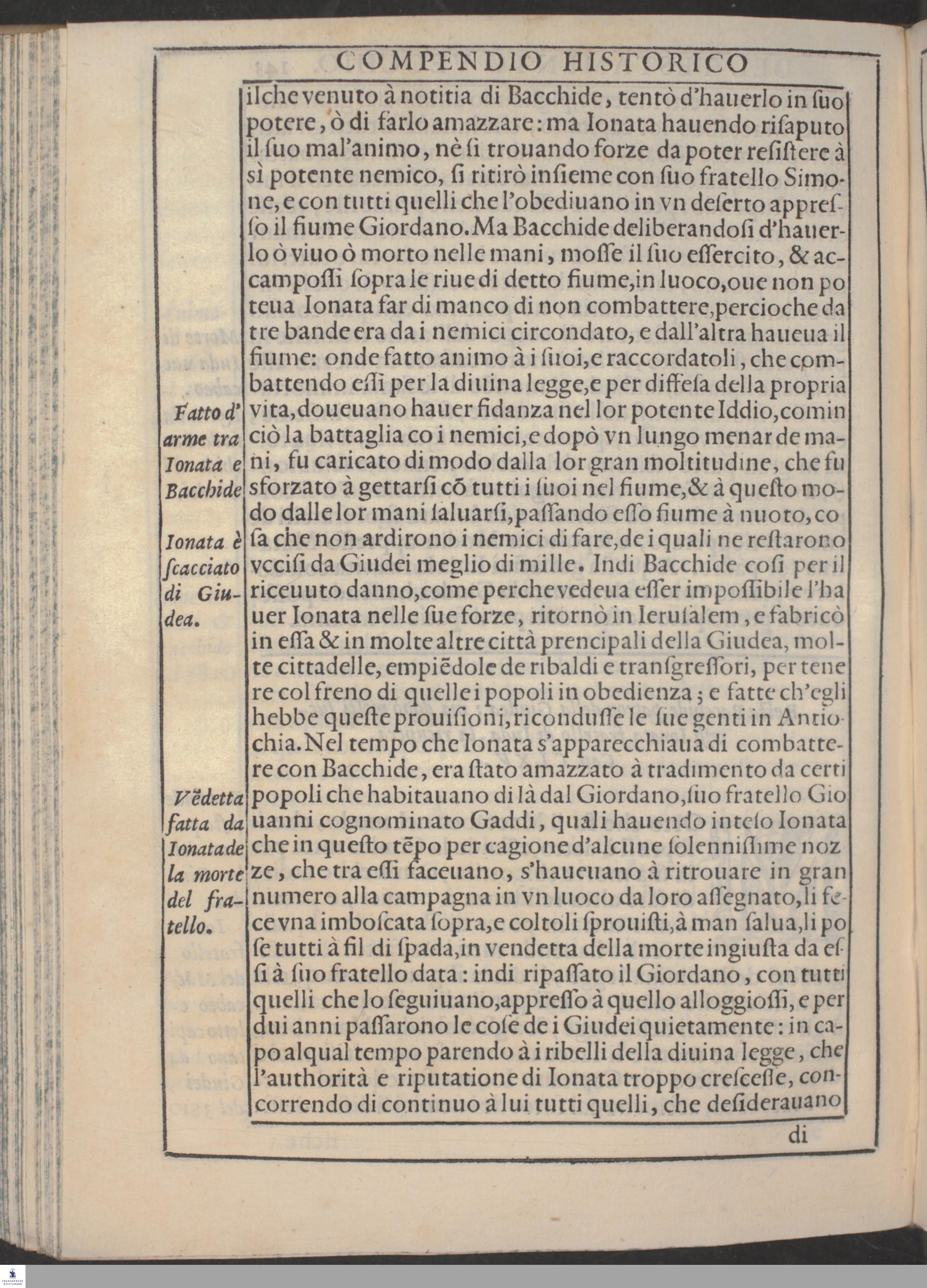 COMPENDIO || HISTORICO || Del Vecchio, e del Nuovo Testamento: || CAVATO DALLA || SACRA BIBBIA, || Da Don Bartolomeo Dionigi da Fano. || Nelquale si descriueno tutte le cose notabili, che successero nel || popolo Hebreo, dalla Creatione del Mondo, sino alla || vltima destruttione di Ierusalem. || Con la vita di Giesv Christo, Saluator del Mondo, & con la disse-||minatione dell'Euangelio, e della sua santa Fede. || Et con due Tauole, l'vna delli Capitoli, l'altra delle cose notabili. || CON PRIVILEGIO. ||