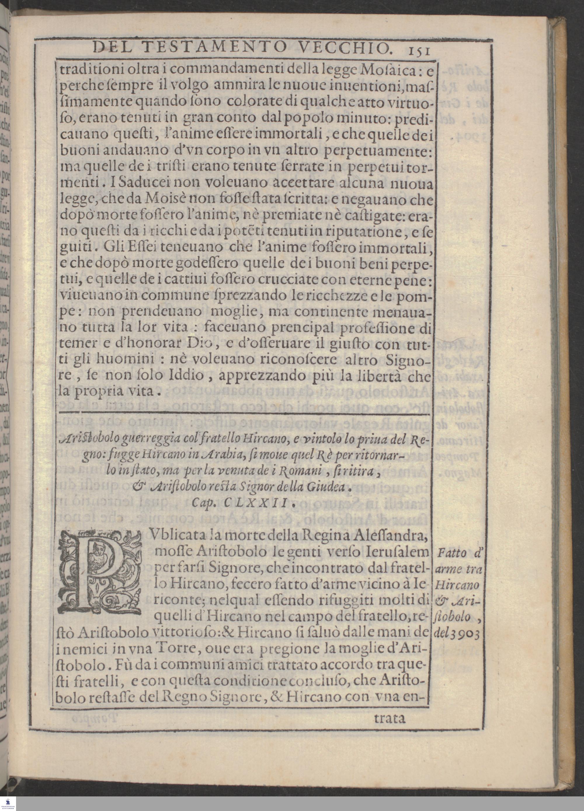 COMPENDIO || HISTORICO || Del Vecchio, e del Nuovo Testamento: || CAVATO DALLA || SACRA BIBBIA, || Da Don Bartolomeo Dionigi da Fano. || Nelquale si descriueno tutte le cose notabili, che successero nel || popolo Hebreo, dalla Creatione del Mondo, sino alla || vltima destruttione di Ierusalem. || Con la vita di Giesv Christo, Saluator del Mondo, & con la disse-||minatione dell'Euangelio, e della sua santa Fede. || Et con due Tauole, l'vna delli Capitoli, l'altra delle cose notabili. || CON PRIVILEGIO. ||