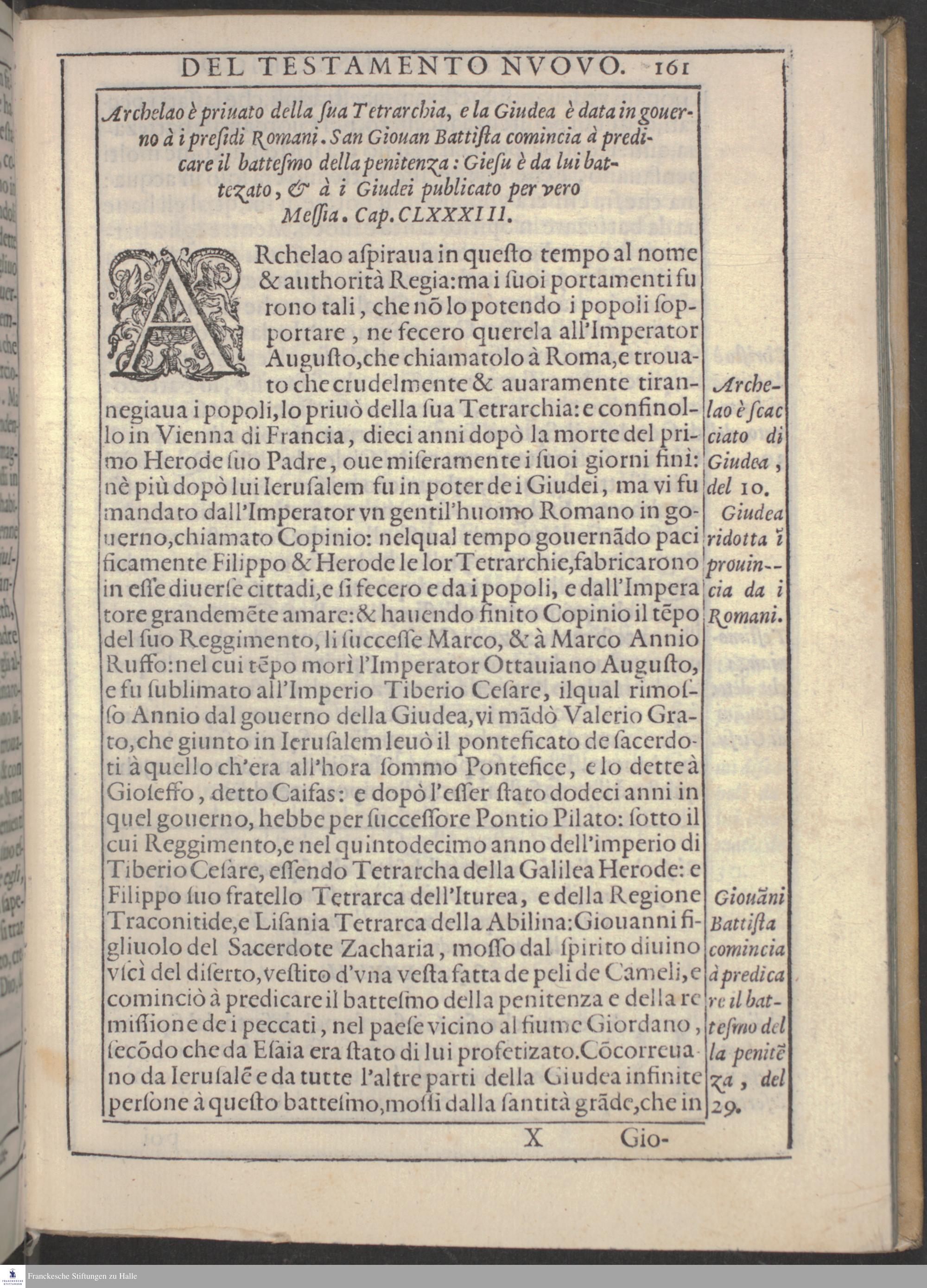 COMPENDIO || HISTORICO || Del Vecchio, e del Nuovo Testamento: || CAVATO DALLA || SACRA BIBBIA, || Da Don Bartolomeo Dionigi da Fano. || Nelquale si descriueno tutte le cose notabili, che successero nel || popolo Hebreo, dalla Creatione del Mondo, sino alla || vltima destruttione di Ierusalem. || Con la vita di Giesv Christo, Saluator del Mondo, & con la disse-||minatione dell'Euangelio, e della sua santa Fede. || Et con due Tauole, l'vna delli Capitoli, l'altra delle cose notabili. || CON PRIVILEGIO. ||