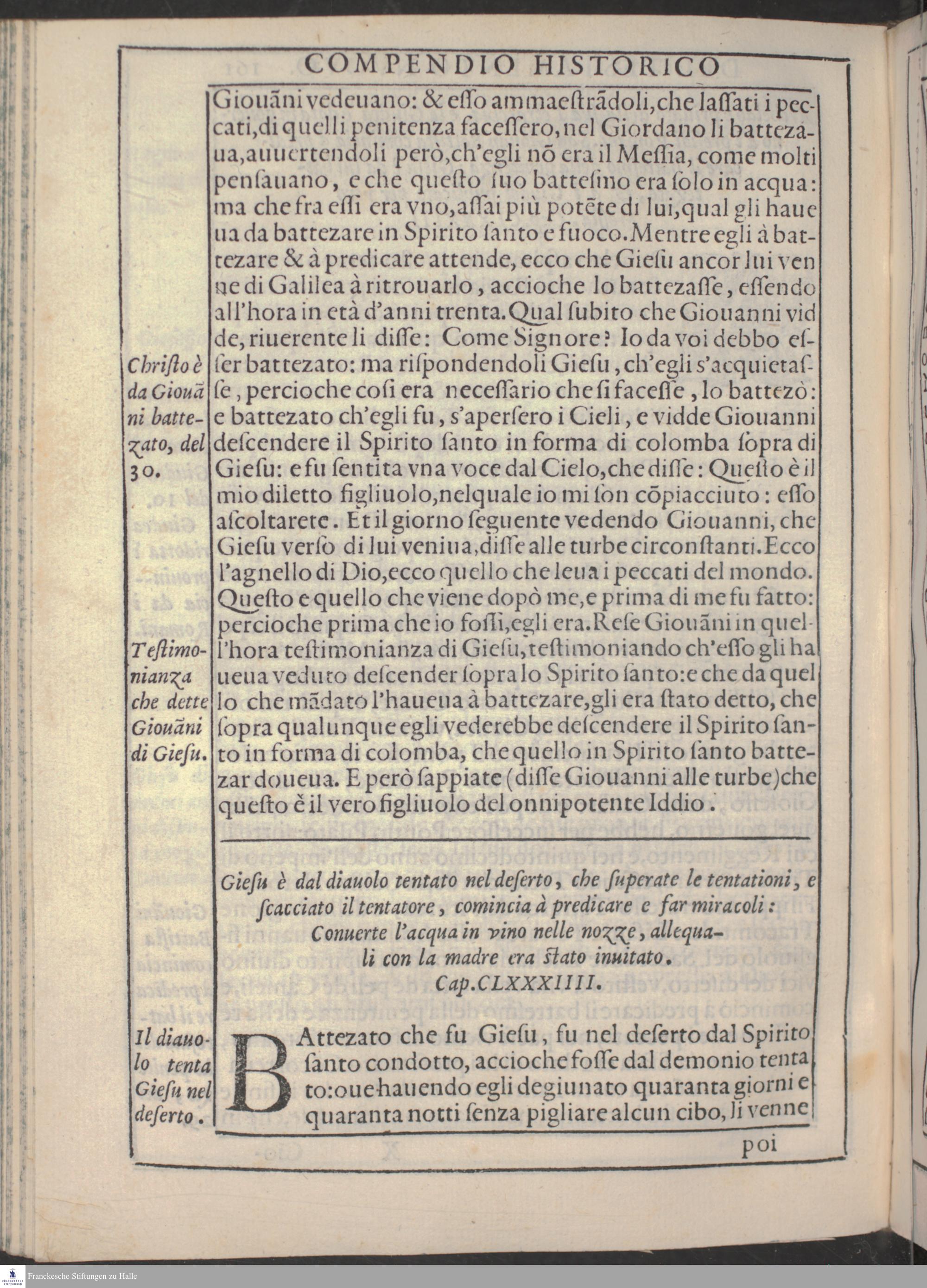 COMPENDIO || HISTORICO || Del Vecchio, e del Nuovo Testamento: || CAVATO DALLA || SACRA BIBBIA, || Da Don Bartolomeo Dionigi da Fano. || Nelquale si descriueno tutte le cose notabili, che successero nel || popolo Hebreo, dalla Creatione del Mondo, sino alla || vltima destruttione di Ierusalem. || Con la vita di Giesv Christo, Saluator del Mondo, & con la disse-||minatione dell'Euangelio, e della sua santa Fede. || Et con due Tauole, l'vna delli Capitoli, l'altra delle cose notabili. || CON PRIVILEGIO. ||