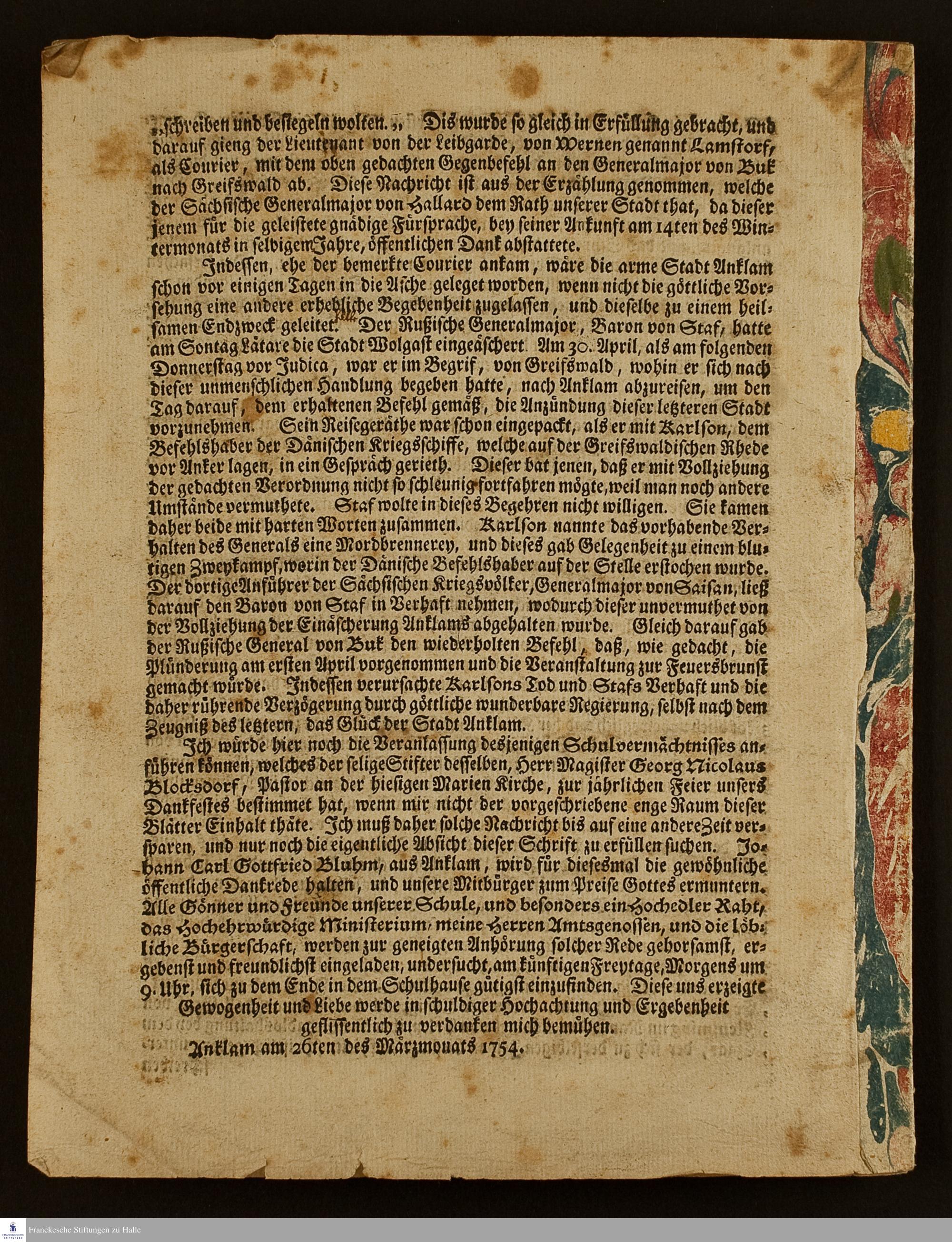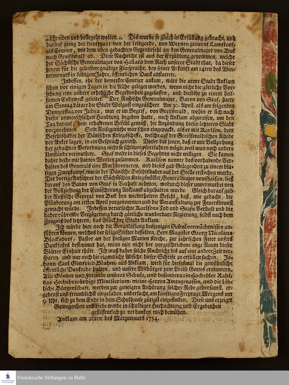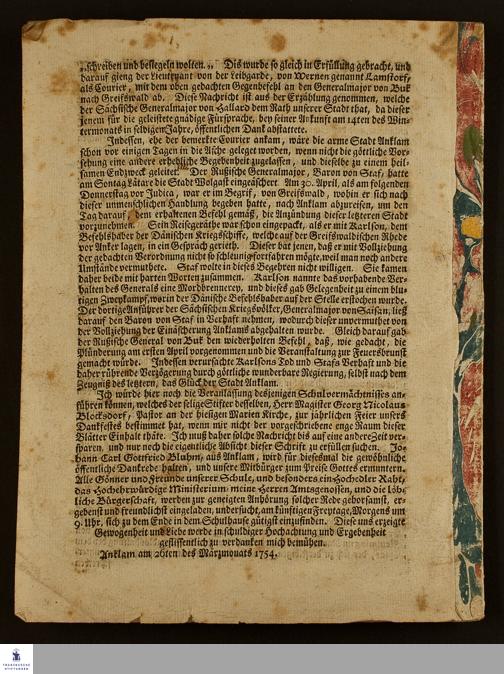 Der Herr führet seinen wunderbaren Raht herrlich hinaus : Diesen Saz wird Carl Gottfried Bluhm, aus Anklam, am Freitage vor Judica, als am jährlichen Gedächtnistage der ... wunderbaren Errettung der Stadt Anklam von der angedroheten gänzlichen Einäscherung in einer deutschen Rede ausführen / zu dieser feierlichen Handlung ladet die sämtlichen Einwohner dieser Stadt geziemend ein und erzälet die merkwürdigsten Geschichte solche Drangsale und Beschüzzung Joachim Friedrich Sprengel, Rector der Rahtsschule zu Anklam ...