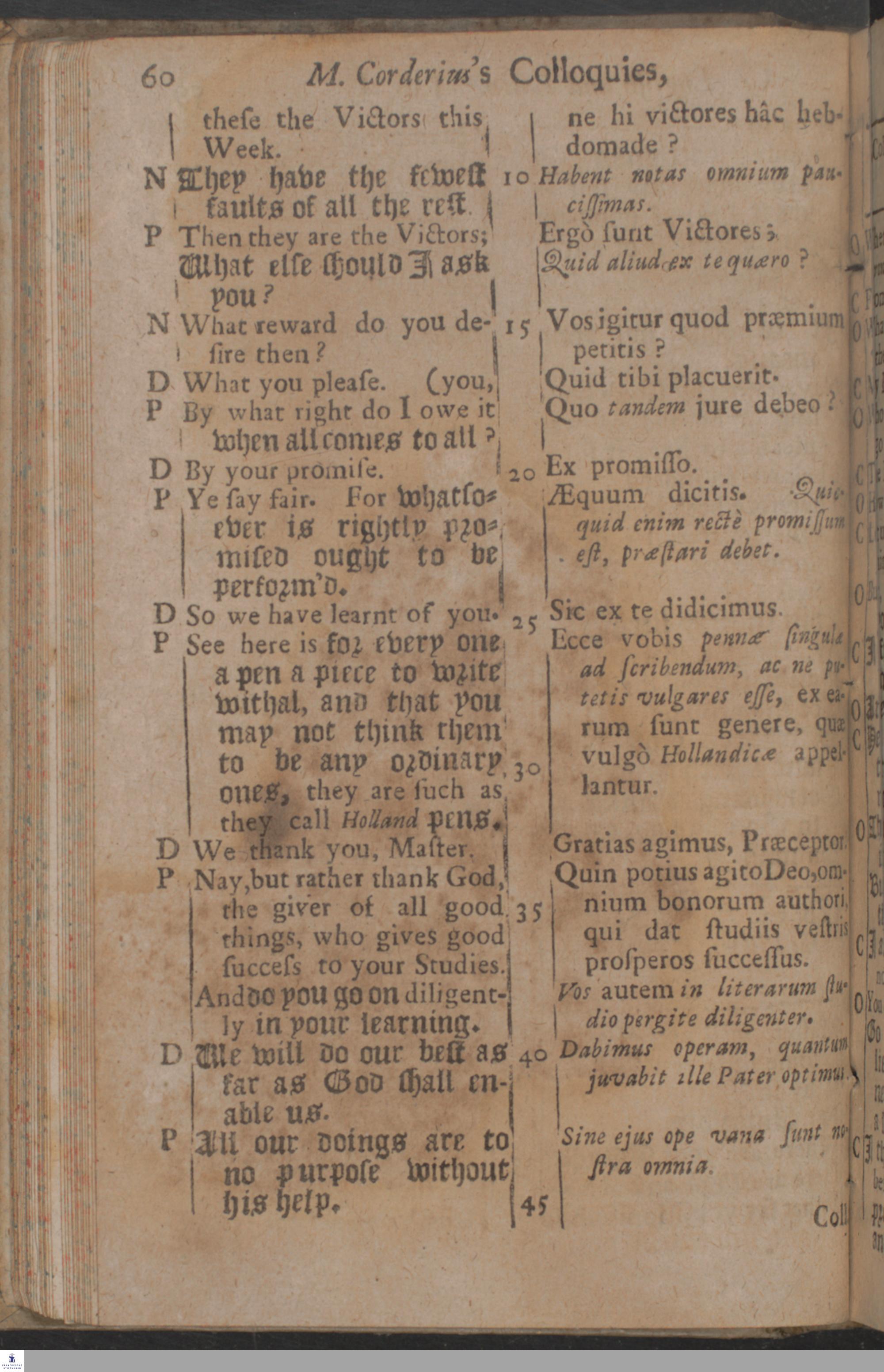Maturini Corderii Colloquia Scholastica Anglo-Latina : In varias Clausulas distributa ; Observato utriusque Linguæ Idiomate ; Quosc. (ope vernaculi) in quotidiano sermone Latino pueri felicius exerceantur ; Positi sunt insuper in utriusque confiniis Numeri, quibus uniuscujusque Vocabuli vel Phrasiōs indicatur locus, & usus genuinus / A Carolo Hoole A. M. è Col. Linc. Oxon. Et nuper apud Londinates Ludimagistro ...