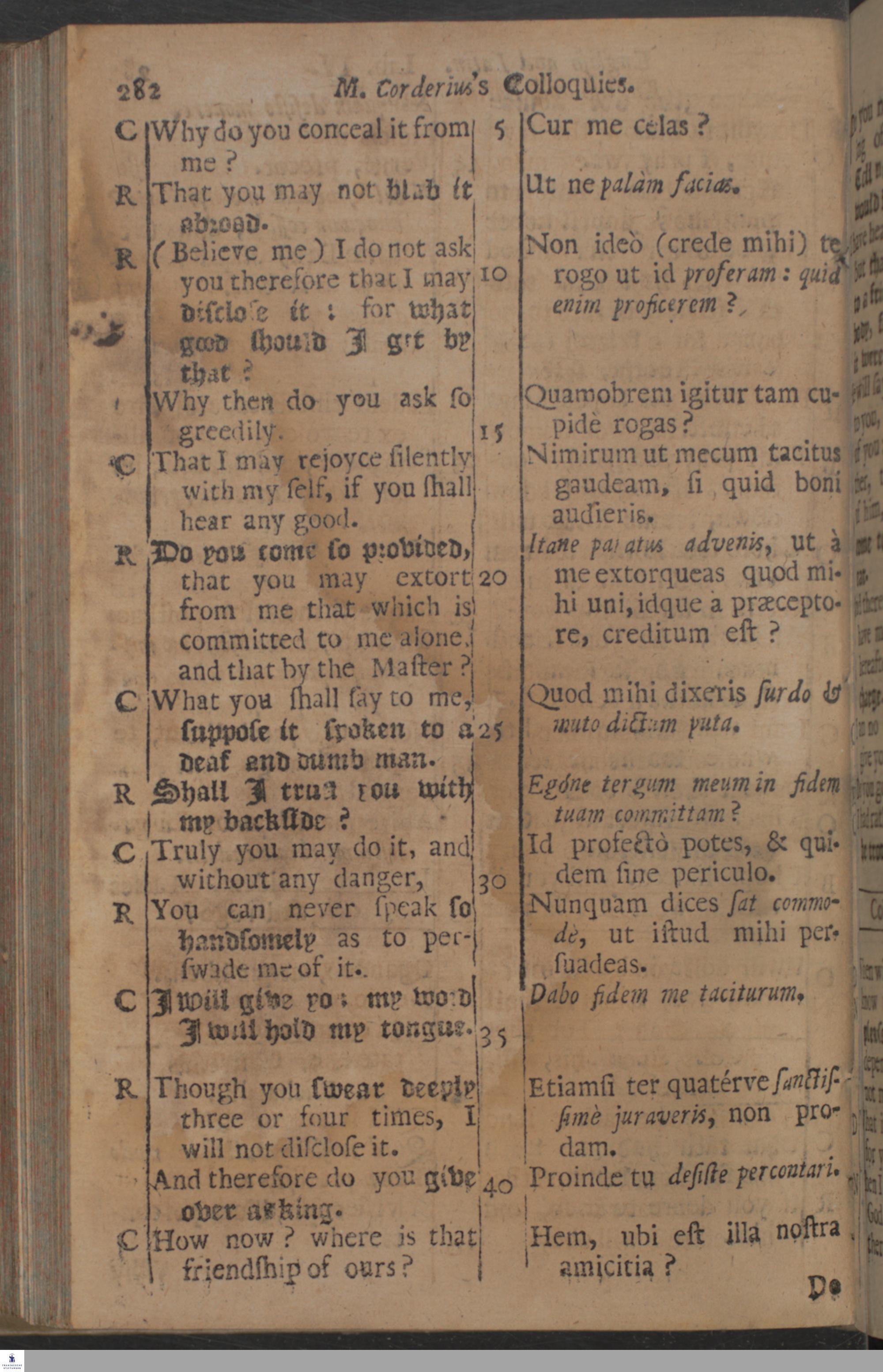 Maturini Corderii Colloquia Scholastica Anglo-Latina : In varias Clausulas distributa ; Observato utriusque Linguæ Idiomate ; Quosc. (ope vernaculi) in quotidiano sermone Latino pueri felicius exerceantur ; Positi sunt insuper in utriusque confiniis Numeri, quibus uniuscujusque Vocabuli vel Phrasiōs indicatur locus, & usus genuinus / A Carolo Hoole A. M. è Col. Linc. Oxon. Et nuper apud Londinates Ludimagistro ...