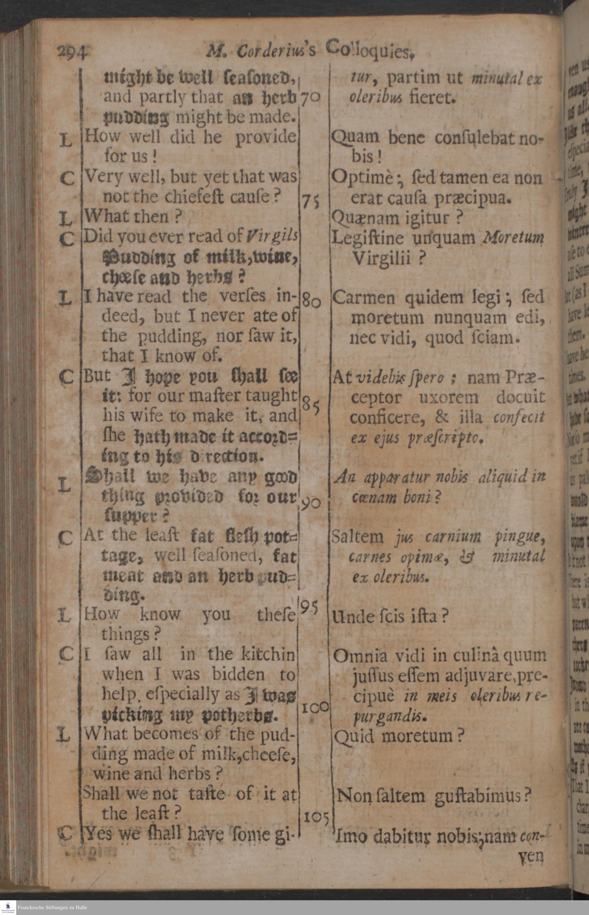 Maturini Corderii Colloquia Scholastica Anglo-Latina : In varias Clausulas distributa ; Observato utriusque Linguæ Idiomate ; Quosc. (ope vernaculi) in quotidiano sermone Latino pueri felicius exerceantur ; Positi sunt insuper in utriusque confiniis Numeri, quibus uniuscujusque Vocabuli vel Phrasiōs indicatur locus, & usus genuinus / A Carolo Hoole A. M. è Col. Linc. Oxon. Et nuper apud Londinates Ludimagistro ...
