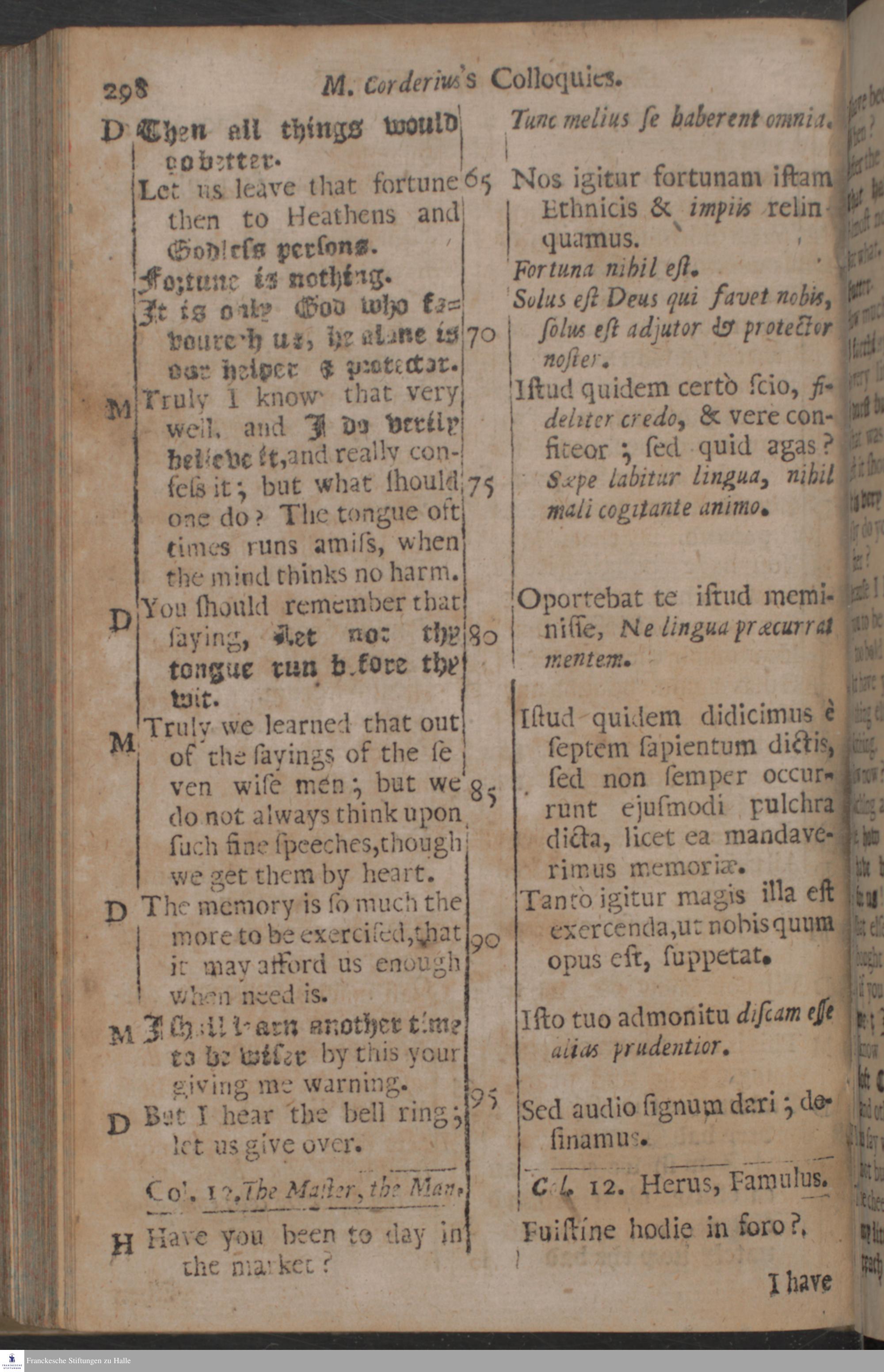 Maturini Corderii Colloquia Scholastica Anglo-Latina : In varias Clausulas distributa ; Observato utriusque Linguæ Idiomate ; Quosc. (ope vernaculi) in quotidiano sermone Latino pueri felicius exerceantur ; Positi sunt insuper in utriusque confiniis Numeri, quibus uniuscujusque Vocabuli vel Phrasiōs indicatur locus, & usus genuinus / A Carolo Hoole A. M. è Col. Linc. Oxon. Et nuper apud Londinates Ludimagistro ...
