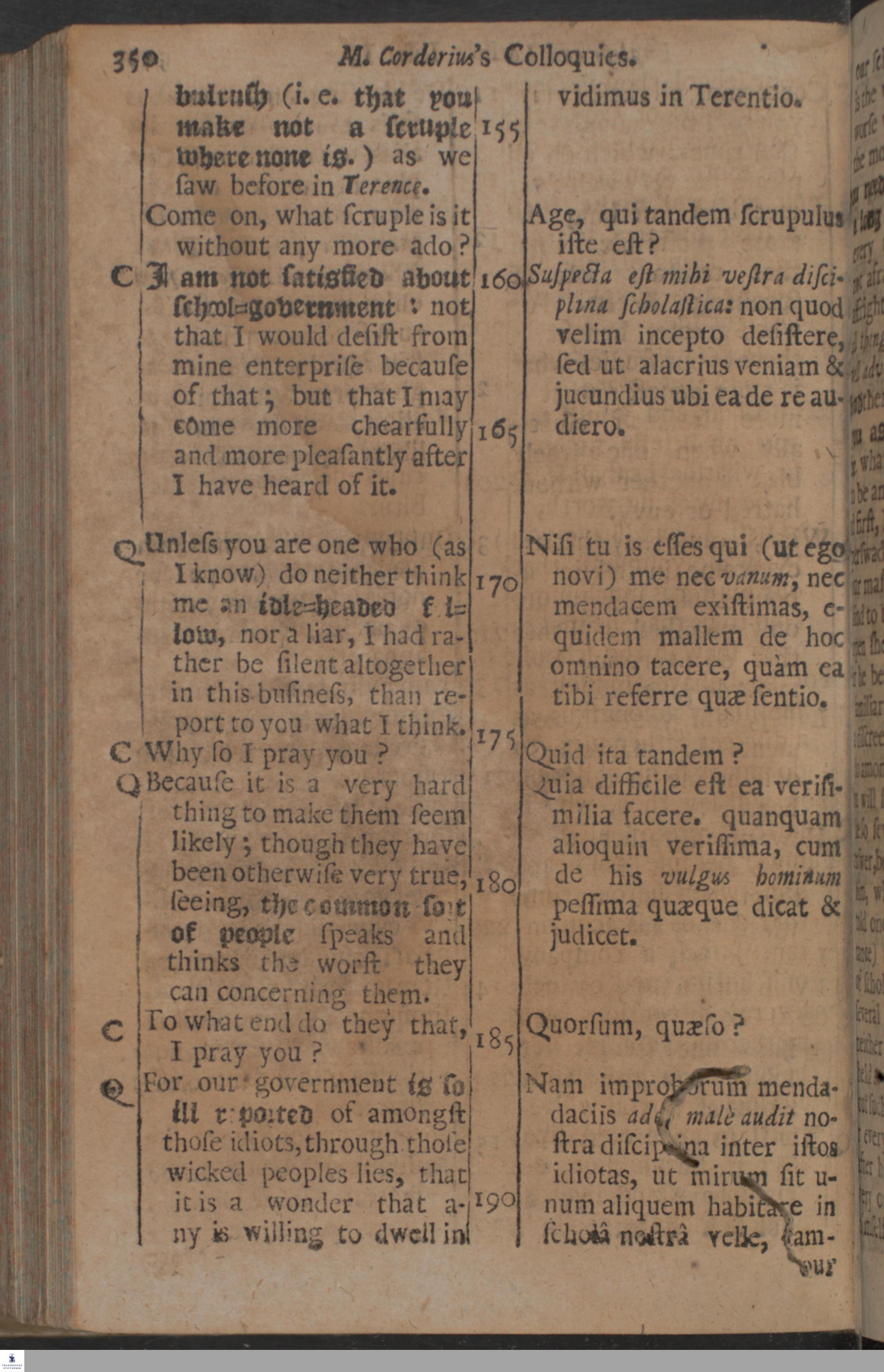 Maturini Corderii Colloquia Scholastica Anglo-Latina : In varias Clausulas distributa ; Observato utriusque Linguæ Idiomate ; Quosc. (ope vernaculi) in quotidiano sermone Latino pueri felicius exerceantur ; Positi sunt insuper in utriusque confiniis Numeri, quibus uniuscujusque Vocabuli vel Phrasiōs indicatur locus, & usus genuinus / A Carolo Hoole A. M. è Col. Linc. Oxon. Et nuper apud Londinates Ludimagistro ...