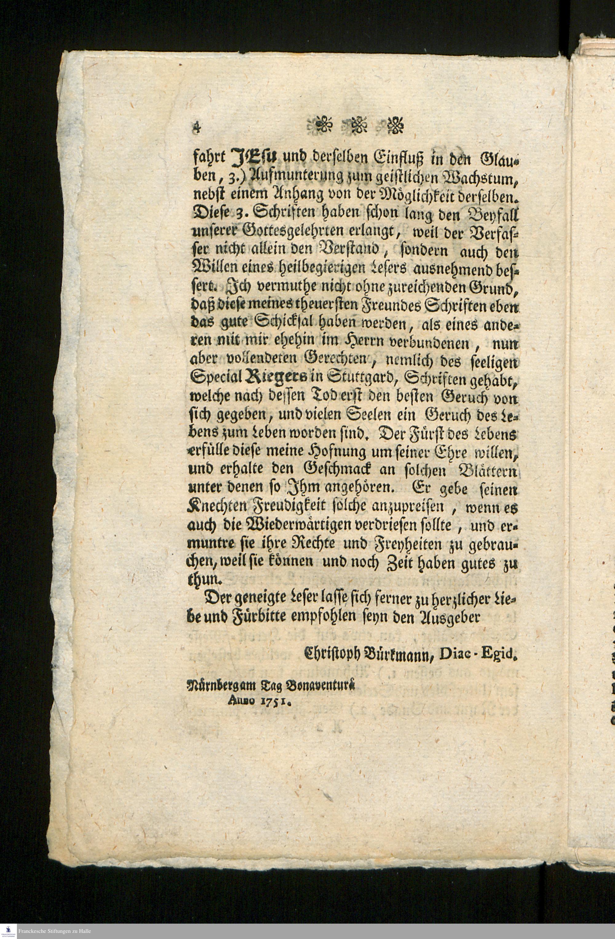 Trifolium Rieschianum, oder Blumen eines lieblichen Geruchs von einem gewesenen Gärtner des Herrn am Boden-See : zur Stärk- und Verwahrung der Gesunden, zur Heil- und Erquicklung der Kranken vormals gepflanzet / jetzo aber wiederum gutherzig dargeboten von einem Gärtner des Herrn am Pegnitzsstrande [Senior Riesch]; [Christoph Bürkmann, Diac. Egid.]