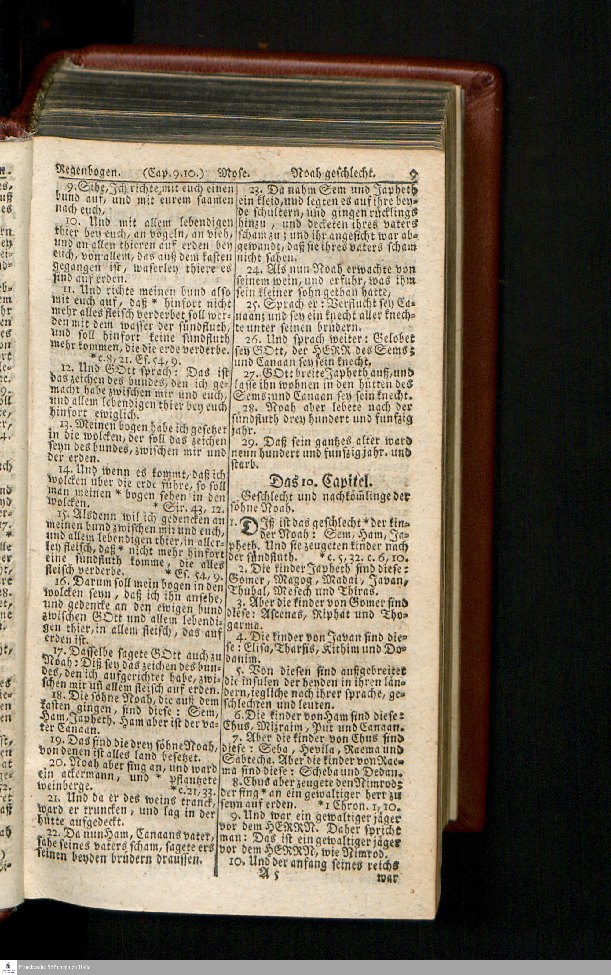 Biblia, Das ist: Die gantze Heil. Schrift Altes und Neues Testaments / Nach der Teutschen Ubersetzung D. Martin Luthers; Mit iedes Capitels kurtzen Summarien/ und nöthigsten Parallelen; Mit Fleiß übersehen, Und gegen einige/ sonderlich erstere/ Editiones des sel. Mannes gehalten, auch an unterschiedlichen Orten nach denselben eingerichtet, und von vielen in den bisherigen Exemplarien hin und wieder eingeschlichenen druckfehlern gesaubert. Nebst einer Vorrede Hn. Baron Carl Hildebrands v. Canstein.