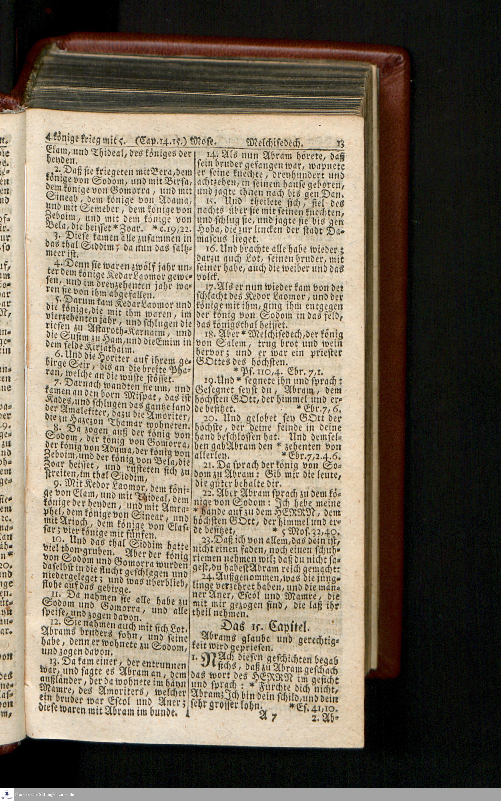 Biblia, Das ist: Die gantze Heil. Schrift Altes und Neues Testaments / Nach der Teutschen Ubersetzung D. Martin Luthers; Mit iedes Capitels kurtzen Summarien/ und nöthigsten Parallelen; Mit Fleiß übersehen, Und gegen einige/ sonderlich erstere/ Editiones des sel. Mannes gehalten, auch an unterschiedlichen Orten nach denselben eingerichtet, und von vielen in den bisherigen Exemplarien hin und wieder eingeschlichenen druckfehlern gesaubert. Nebst einer Vorrede Hn. Baron Carl Hildebrands v. Canstein.