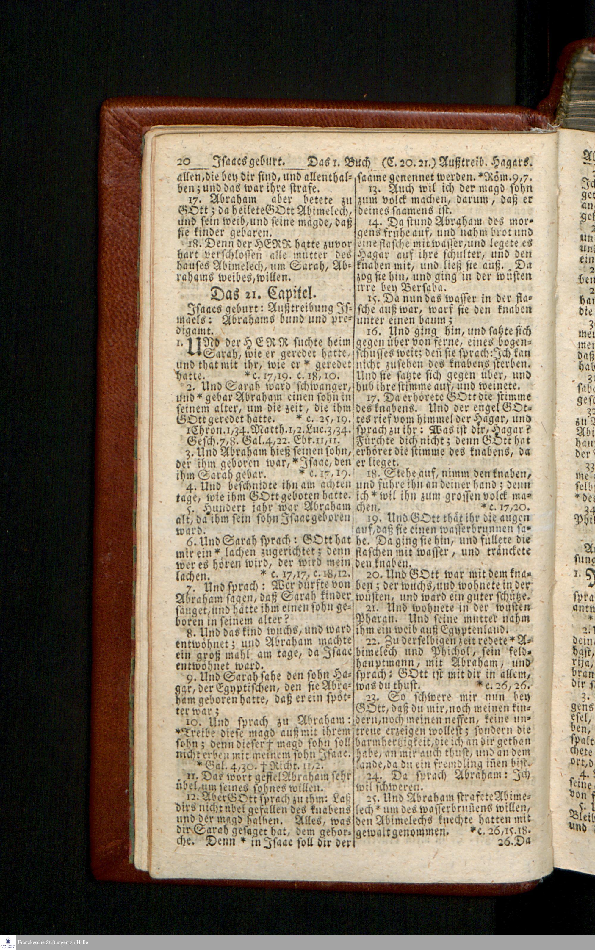 Biblia, Das ist: Die gantze Heil. Schrift Altes und Neues Testaments / Nach der Teutschen Ubersetzung D. Martin Luthers; Mit iedes Capitels kurtzen Summarien/ und nöthigsten Parallelen; Mit Fleiß übersehen, Und gegen einige/ sonderlich erstere/ Editiones des sel. Mannes gehalten, auch an unterschiedlichen Orten nach denselben eingerichtet, und von vielen in den bisherigen Exemplarien hin und wieder eingeschlichenen druckfehlern gesaubert. Nebst einer Vorrede Hn. Baron Carl Hildebrands v. Canstein.