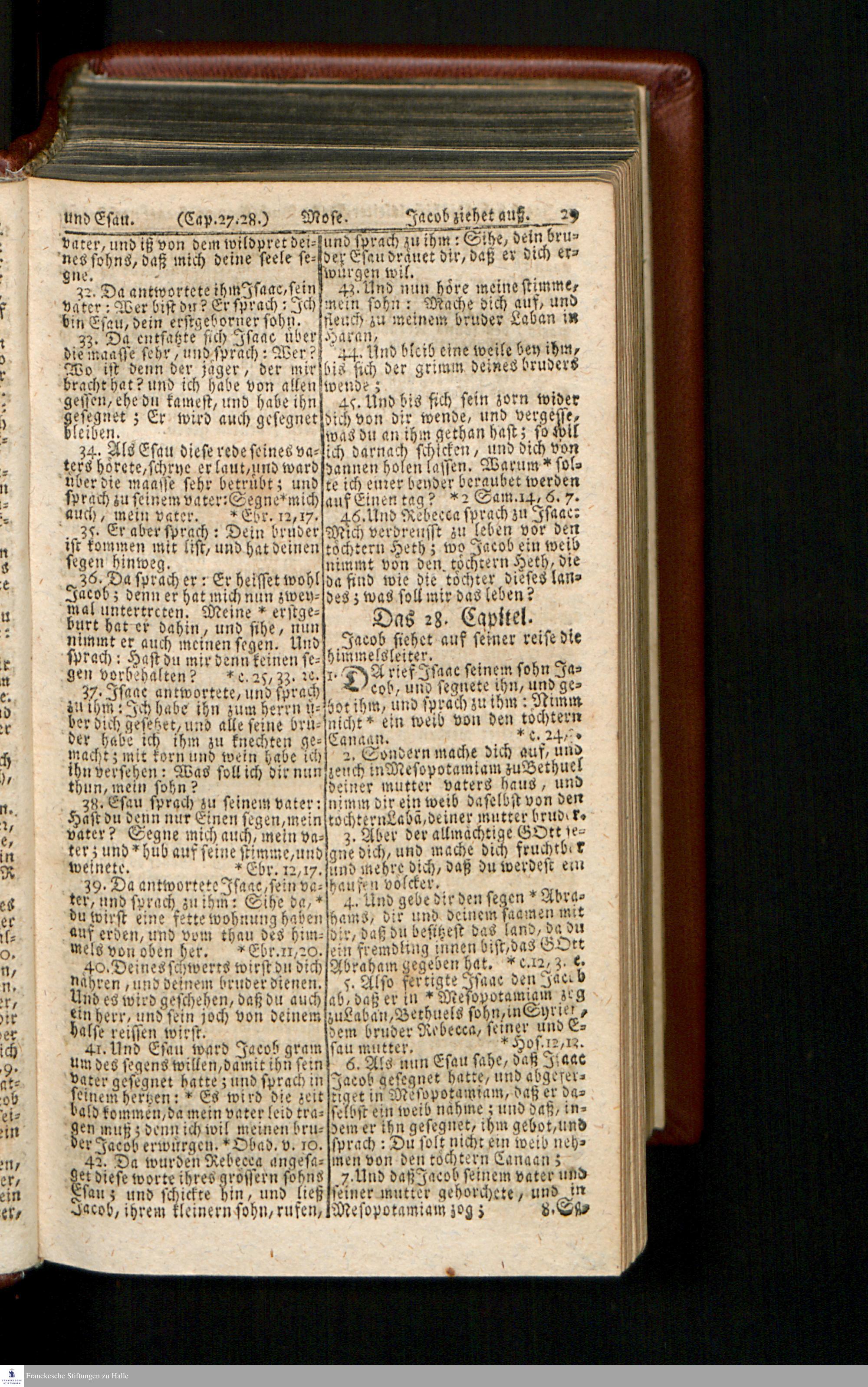 Biblia, Das ist: Die gantze Heil. Schrift Altes und Neues Testaments / Nach der Teutschen Ubersetzung D. Martin Luthers; Mit iedes Capitels kurtzen Summarien/ und nöthigsten Parallelen; Mit Fleiß übersehen, Und gegen einige/ sonderlich erstere/ Editiones des sel. Mannes gehalten, auch an unterschiedlichen Orten nach denselben eingerichtet, und von vielen in den bisherigen Exemplarien hin und wieder eingeschlichenen druckfehlern gesaubert. Nebst einer Vorrede Hn. Baron Carl Hildebrands v. Canstein.