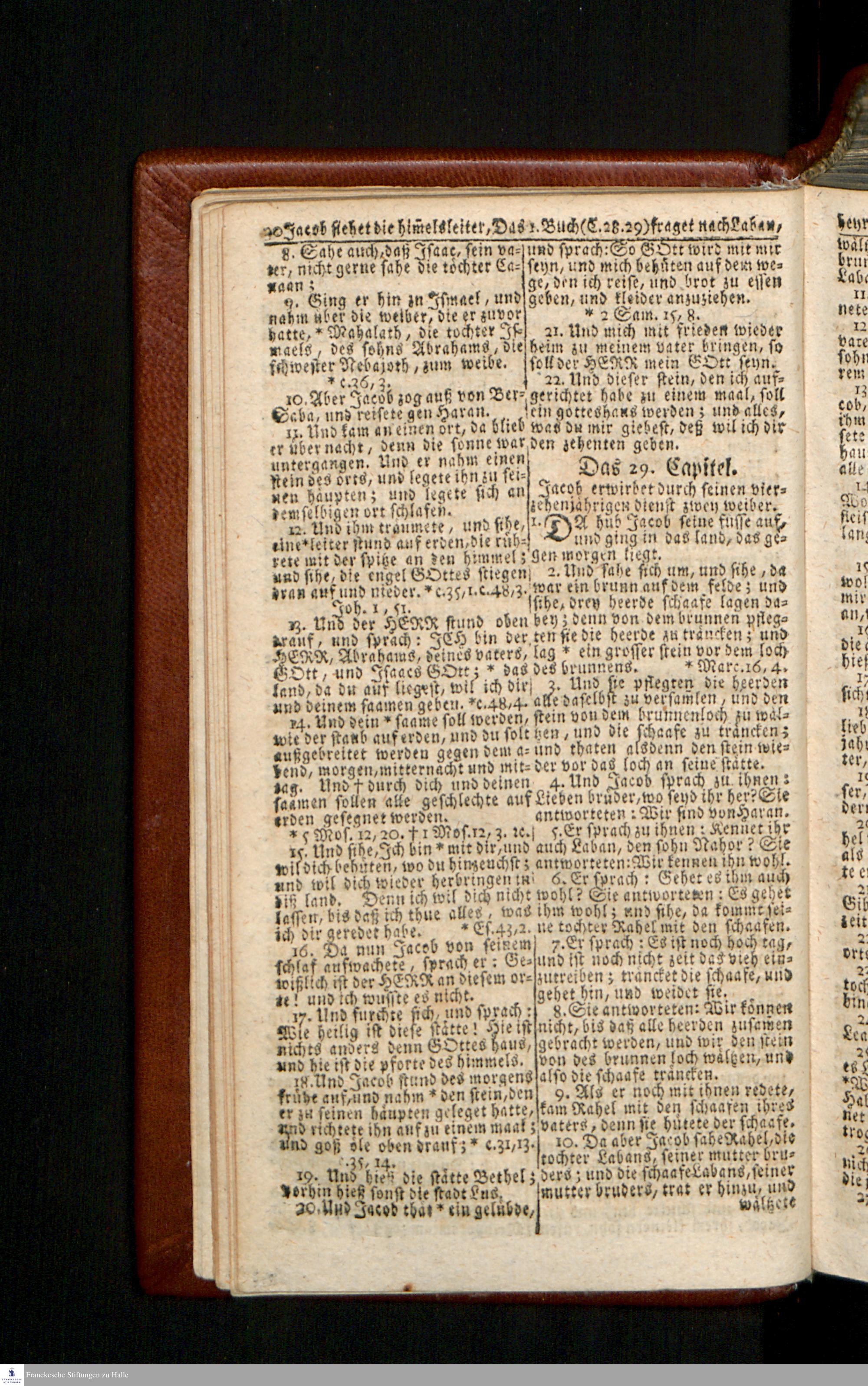 Biblia, Das ist: Die gantze Heil. Schrift Altes und Neues Testaments / Nach der Teutschen Ubersetzung D. Martin Luthers; Mit iedes Capitels kurtzen Summarien/ und nöthigsten Parallelen; Mit Fleiß übersehen, Und gegen einige/ sonderlich erstere/ Editiones des sel. Mannes gehalten, auch an unterschiedlichen Orten nach denselben eingerichtet, und von vielen in den bisherigen Exemplarien hin und wieder eingeschlichenen druckfehlern gesaubert. Nebst einer Vorrede Hn. Baron Carl Hildebrands v. Canstein.