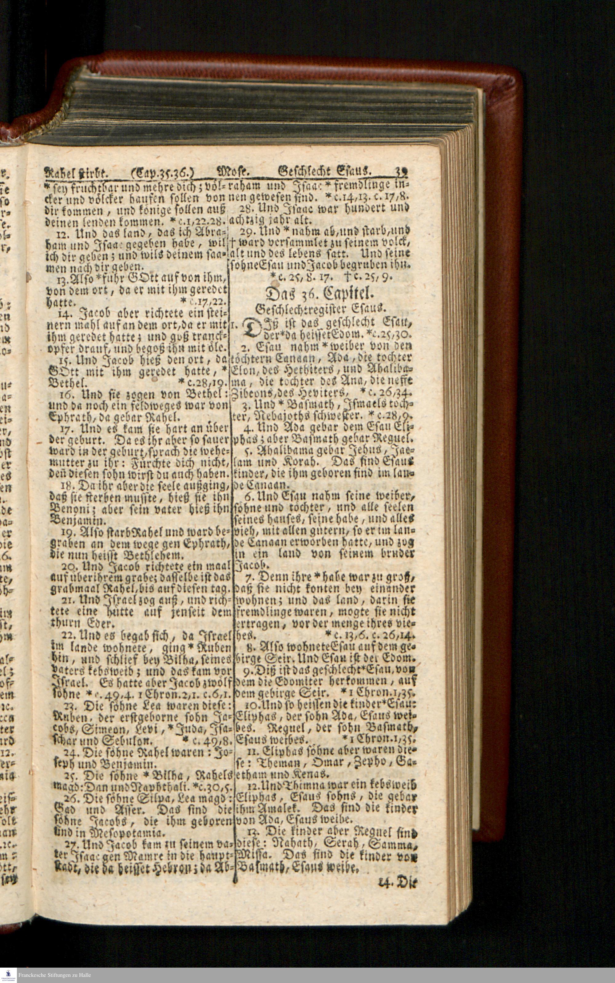 Biblia, Das ist: Die gantze Heil. Schrift Altes und Neues Testaments / Nach der Teutschen Ubersetzung D. Martin Luthers; Mit iedes Capitels kurtzen Summarien/ und nöthigsten Parallelen; Mit Fleiß übersehen, Und gegen einige/ sonderlich erstere/ Editiones des sel. Mannes gehalten, auch an unterschiedlichen Orten nach denselben eingerichtet, und von vielen in den bisherigen Exemplarien hin und wieder eingeschlichenen druckfehlern gesaubert. Nebst einer Vorrede Hn. Baron Carl Hildebrands v. Canstein.