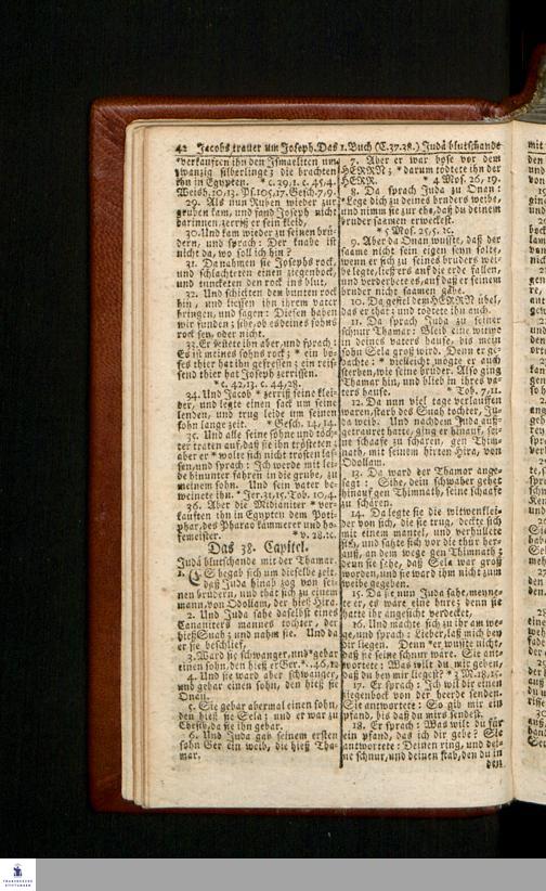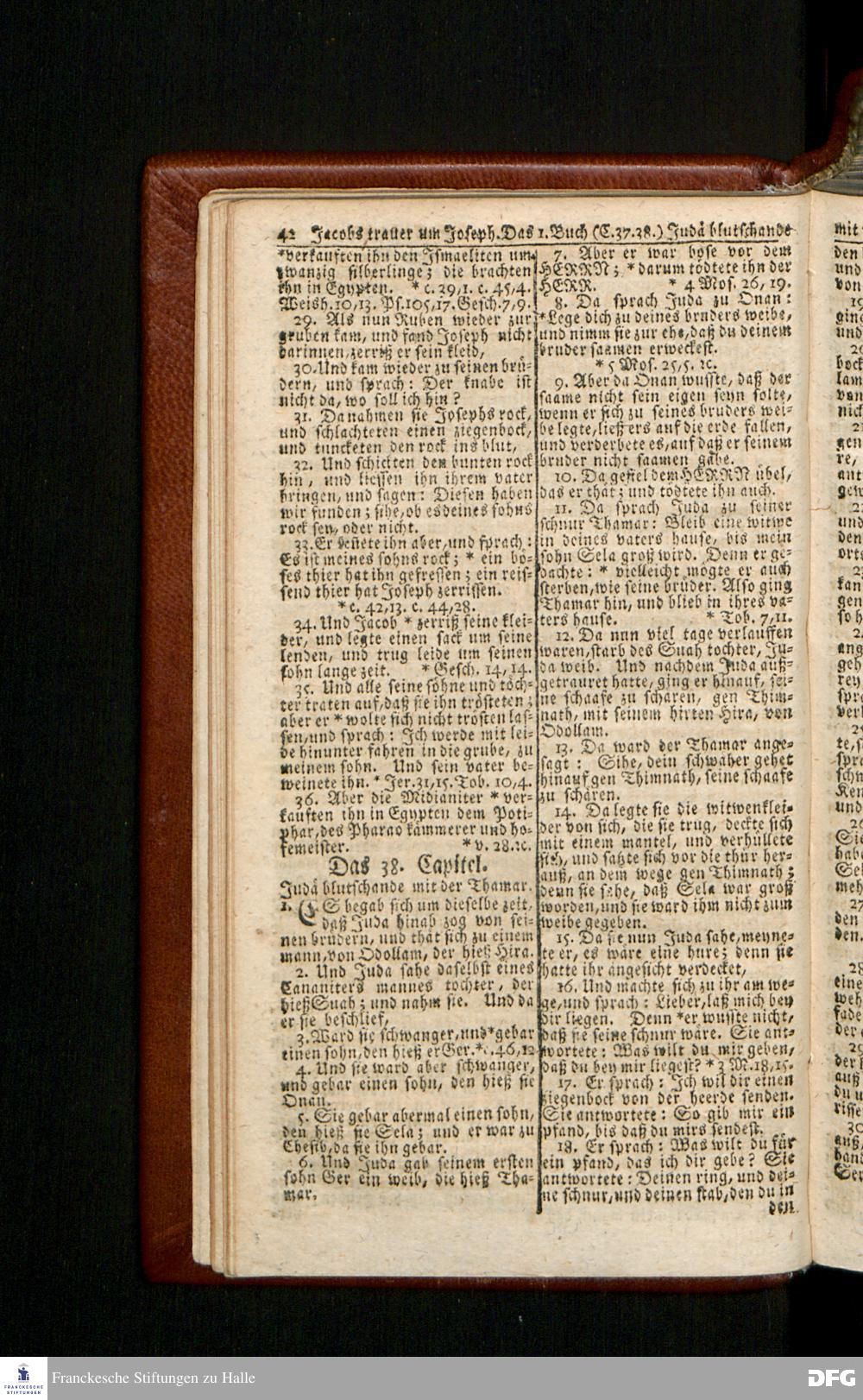 Biblia, Das ist: Die gantze Heil. Schrift Altes und Neues Testaments / Nach der Teutschen Ubersetzung D. Martin Luthers; Mit iedes Capitels kurtzen Summarien/ und nöthigsten Parallelen; Mit Fleiß übersehen, Und gegen einige/ sonderlich erstere/ Editiones des sel. Mannes gehalten, auch an unterschiedlichen Orten nach denselben eingerichtet, und von vielen in den bisherigen Exemplarien hin und wieder eingeschlichenen druckfehlern gesaubert. Nebst einer Vorrede Hn. Baron Carl Hildebrands v. Canstein.