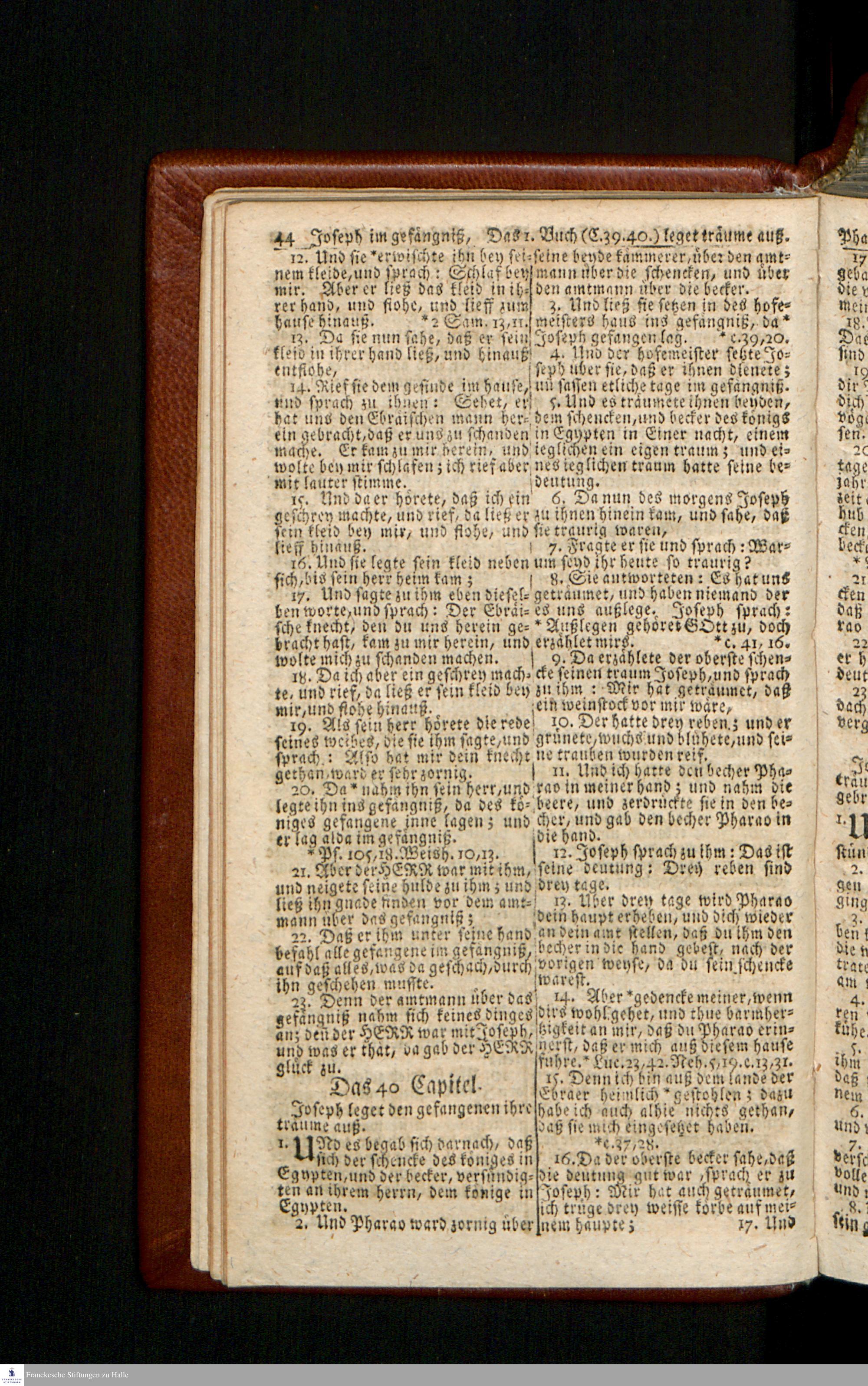 Biblia, Das ist: Die gantze Heil. Schrift Altes und Neues Testaments / Nach der Teutschen Ubersetzung D. Martin Luthers; Mit iedes Capitels kurtzen Summarien/ und nöthigsten Parallelen; Mit Fleiß übersehen, Und gegen einige/ sonderlich erstere/ Editiones des sel. Mannes gehalten, auch an unterschiedlichen Orten nach denselben eingerichtet, und von vielen in den bisherigen Exemplarien hin und wieder eingeschlichenen druckfehlern gesaubert. Nebst einer Vorrede Hn. Baron Carl Hildebrands v. Canstein.