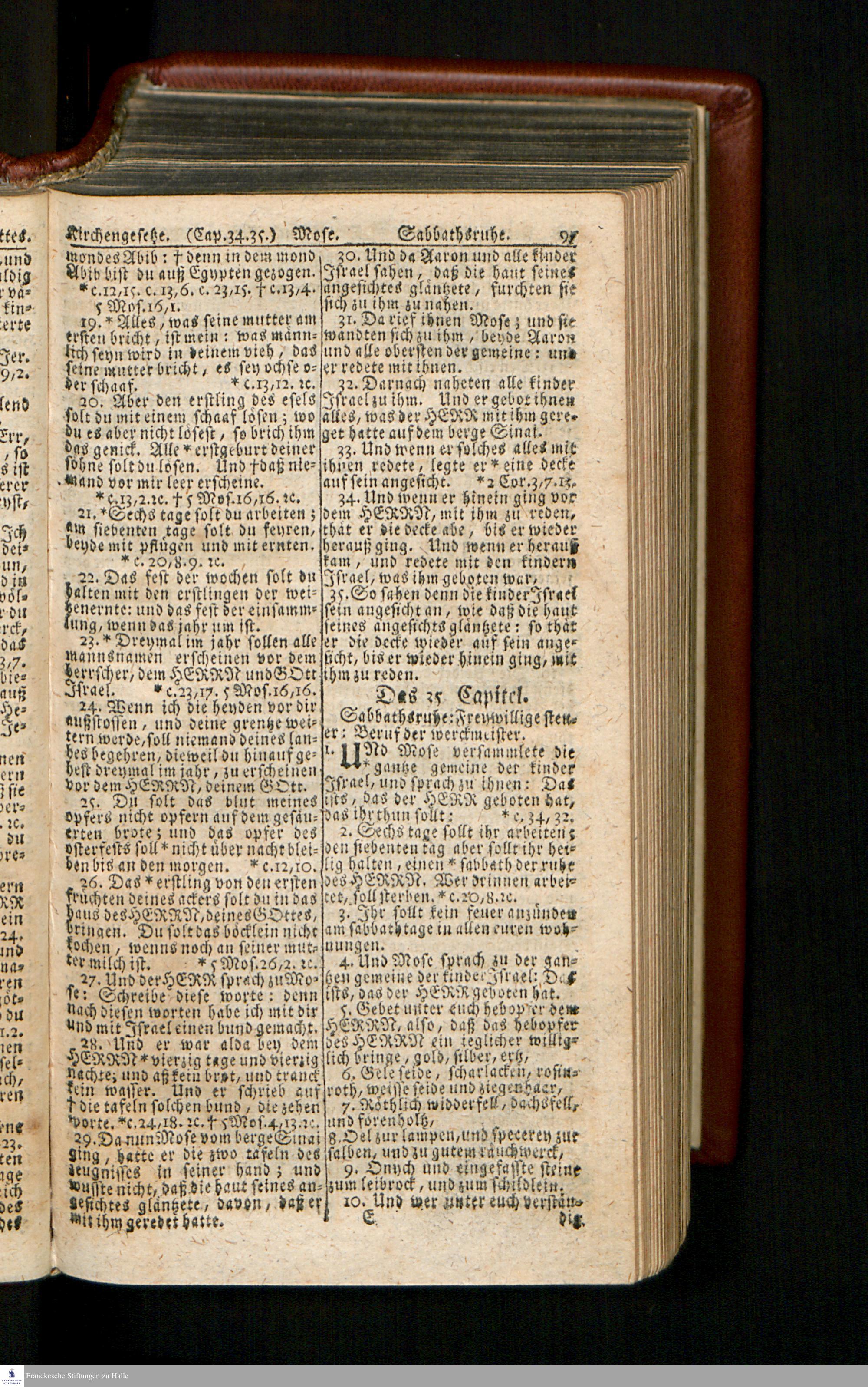 Biblia, Das ist: Die gantze Heil. Schrift Altes und Neues Testaments / Nach der Teutschen Ubersetzung D. Martin Luthers; Mit iedes Capitels kurtzen Summarien/ und nöthigsten Parallelen; Mit Fleiß übersehen, Und gegen einige/ sonderlich erstere/ Editiones des sel. Mannes gehalten, auch an unterschiedlichen Orten nach denselben eingerichtet, und von vielen in den bisherigen Exemplarien hin und wieder eingeschlichenen druckfehlern gesaubert. Nebst einer Vorrede Hn. Baron Carl Hildebrands v. Canstein.