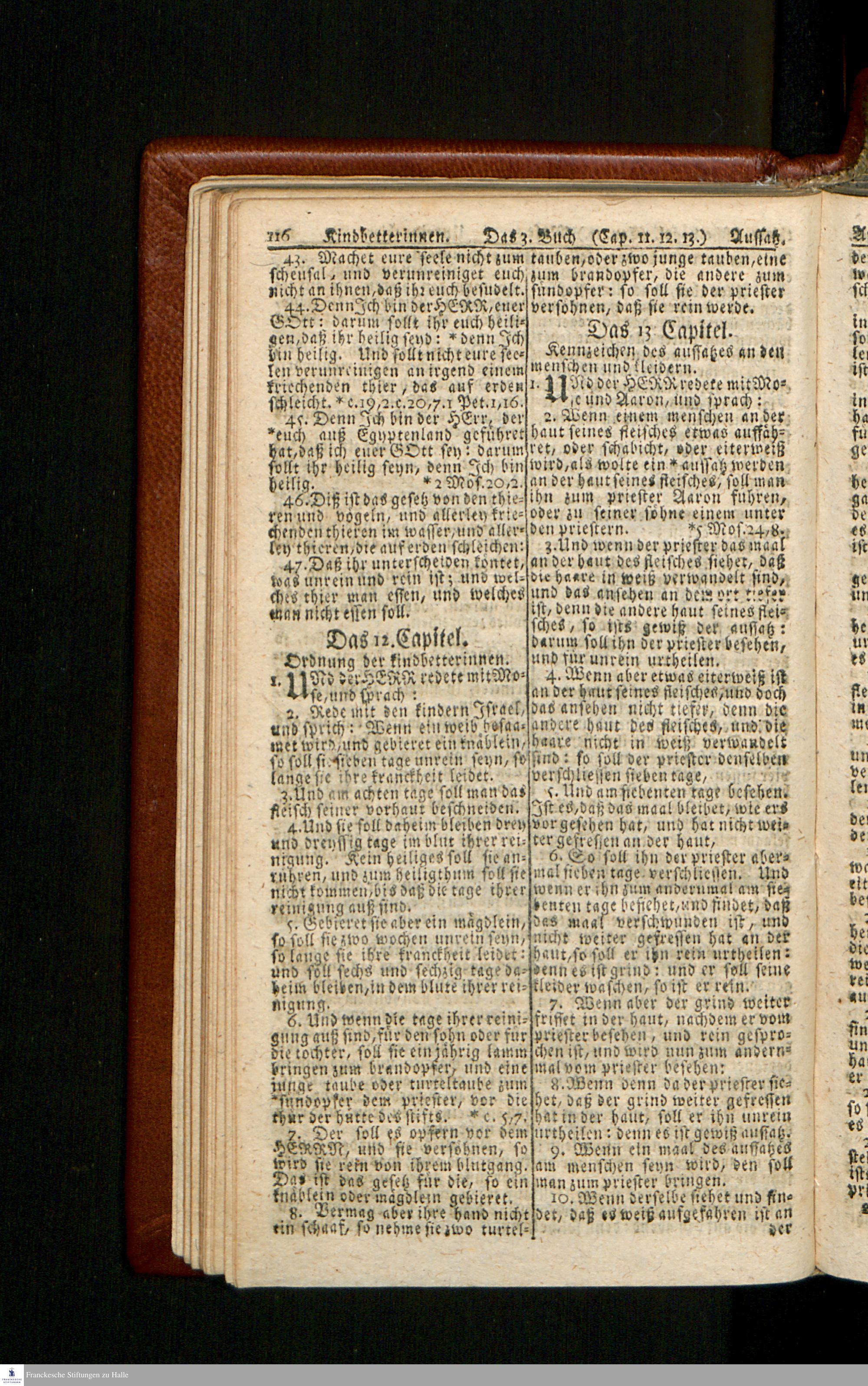 Biblia, Das ist: Die gantze Heil. Schrift Altes und Neues Testaments / Nach der Teutschen Ubersetzung D. Martin Luthers; Mit iedes Capitels kurtzen Summarien/ und nöthigsten Parallelen; Mit Fleiß übersehen, Und gegen einige/ sonderlich erstere/ Editiones des sel. Mannes gehalten, auch an unterschiedlichen Orten nach denselben eingerichtet, und von vielen in den bisherigen Exemplarien hin und wieder eingeschlichenen druckfehlern gesaubert. Nebst einer Vorrede Hn. Baron Carl Hildebrands v. Canstein.