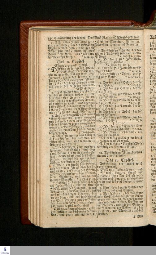 Biblia, Das ist: Die gantze Heil. Schrift Altes und Neues Testaments / Nach der Teutschen Ubersetzung D. Martin Luthers; Mit iedes Capitels kurtzen Summarien/ und nöthigsten Parallelen; Mit Fleiß übersehen, Und gegen einige/ sonderlich erstere/ Editiones des sel. Mannes gehalten, auch an unterschiedlichen Orten nach denselben eingerichtet, und von vielen in den bisherigen Exemplarien hin und wieder eingeschlichenen druckfehlern gesaubert. Nebst einer Vorrede Hn. Baron Carl Hildebrands v. Canstein.