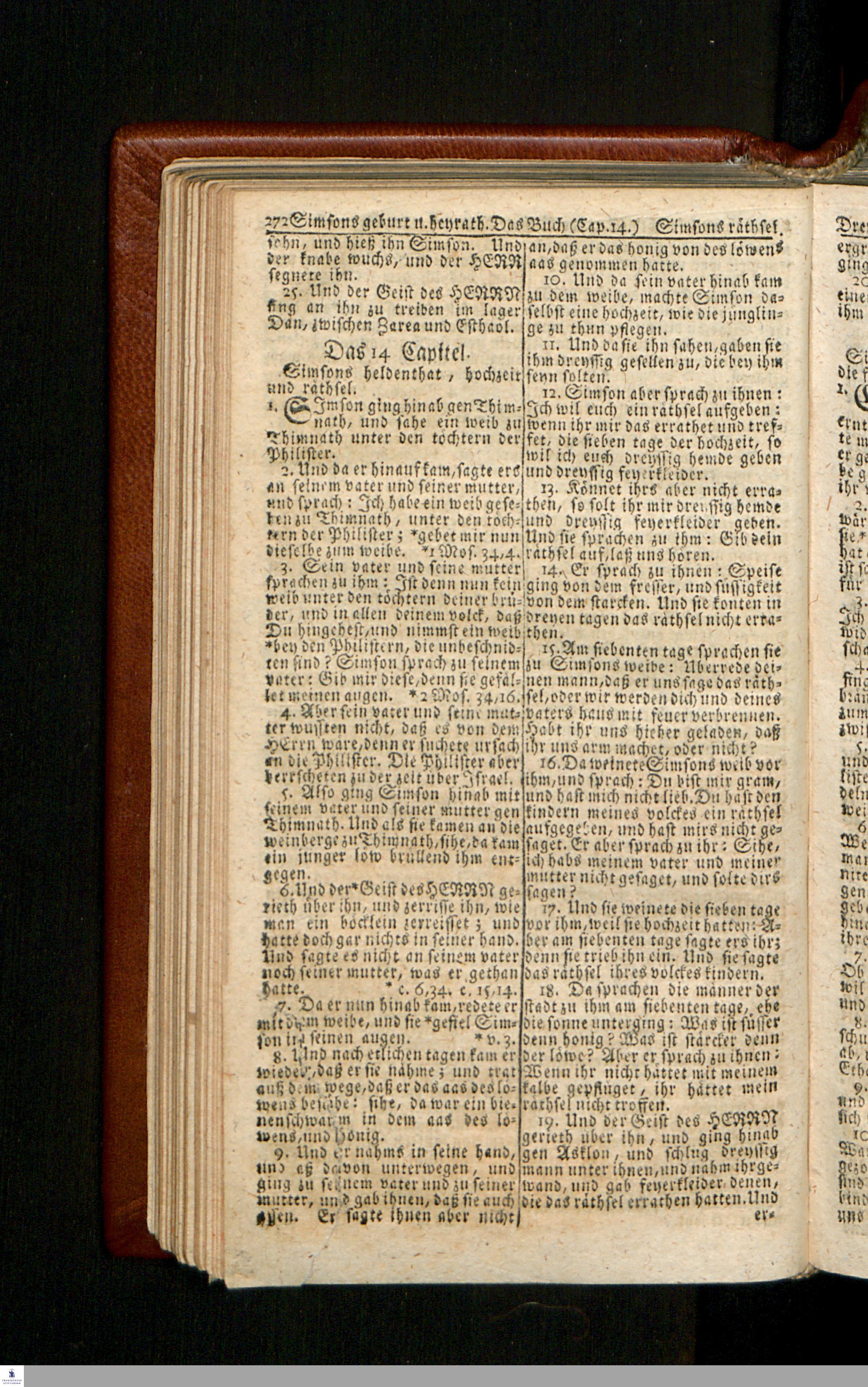 Biblia, Das ist: Die gantze Heil. Schrift Altes und Neues Testaments / Nach der Teutschen Ubersetzung D. Martin Luthers; Mit iedes Capitels kurtzen Summarien/ und nöthigsten Parallelen; Mit Fleiß übersehen, Und gegen einige/ sonderlich erstere/ Editiones des sel. Mannes gehalten, auch an unterschiedlichen Orten nach denselben eingerichtet, und von vielen in den bisherigen Exemplarien hin und wieder eingeschlichenen druckfehlern gesaubert. Nebst einer Vorrede Hn. Baron Carl Hildebrands v. Canstein.
