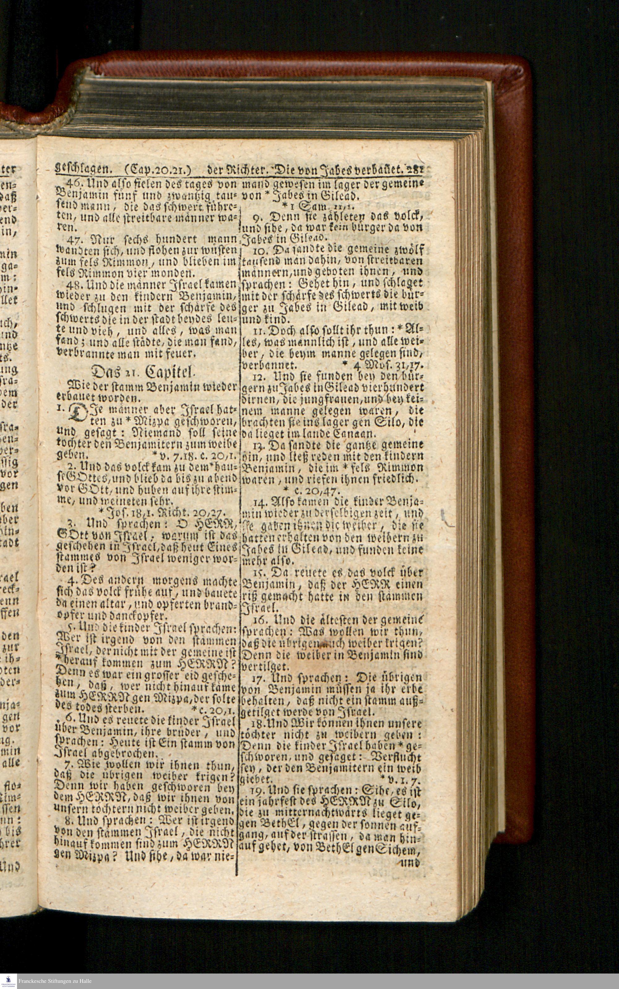 Biblia, Das ist: Die gantze Heil. Schrift Altes und Neues Testaments / Nach der Teutschen Ubersetzung D. Martin Luthers; Mit iedes Capitels kurtzen Summarien/ und nöthigsten Parallelen; Mit Fleiß übersehen, Und gegen einige/ sonderlich erstere/ Editiones des sel. Mannes gehalten, auch an unterschiedlichen Orten nach denselben eingerichtet, und von vielen in den bisherigen Exemplarien hin und wieder eingeschlichenen druckfehlern gesaubert. Nebst einer Vorrede Hn. Baron Carl Hildebrands v. Canstein.