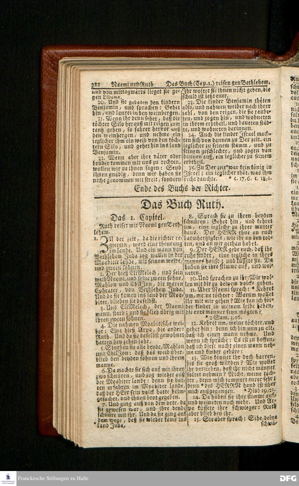 Biblia, Das ist: Die gantze Heil. Schrift Altes und Neues Testaments / Nach der Teutschen Ubersetzung D. Martin Luthers; Mit iedes Capitels kurtzen Summarien/ und nöthigsten Parallelen; Mit Fleiß übersehen, Und gegen einige/ sonderlich erstere/ Editiones des sel. Mannes gehalten, auch an unterschiedlichen Orten nach denselben eingerichtet, und von vielen in den bisherigen Exemplarien hin und wieder eingeschlichenen druckfehlern gesaubert. Nebst einer Vorrede Hn. Baron Carl Hildebrands v. Canstein.
