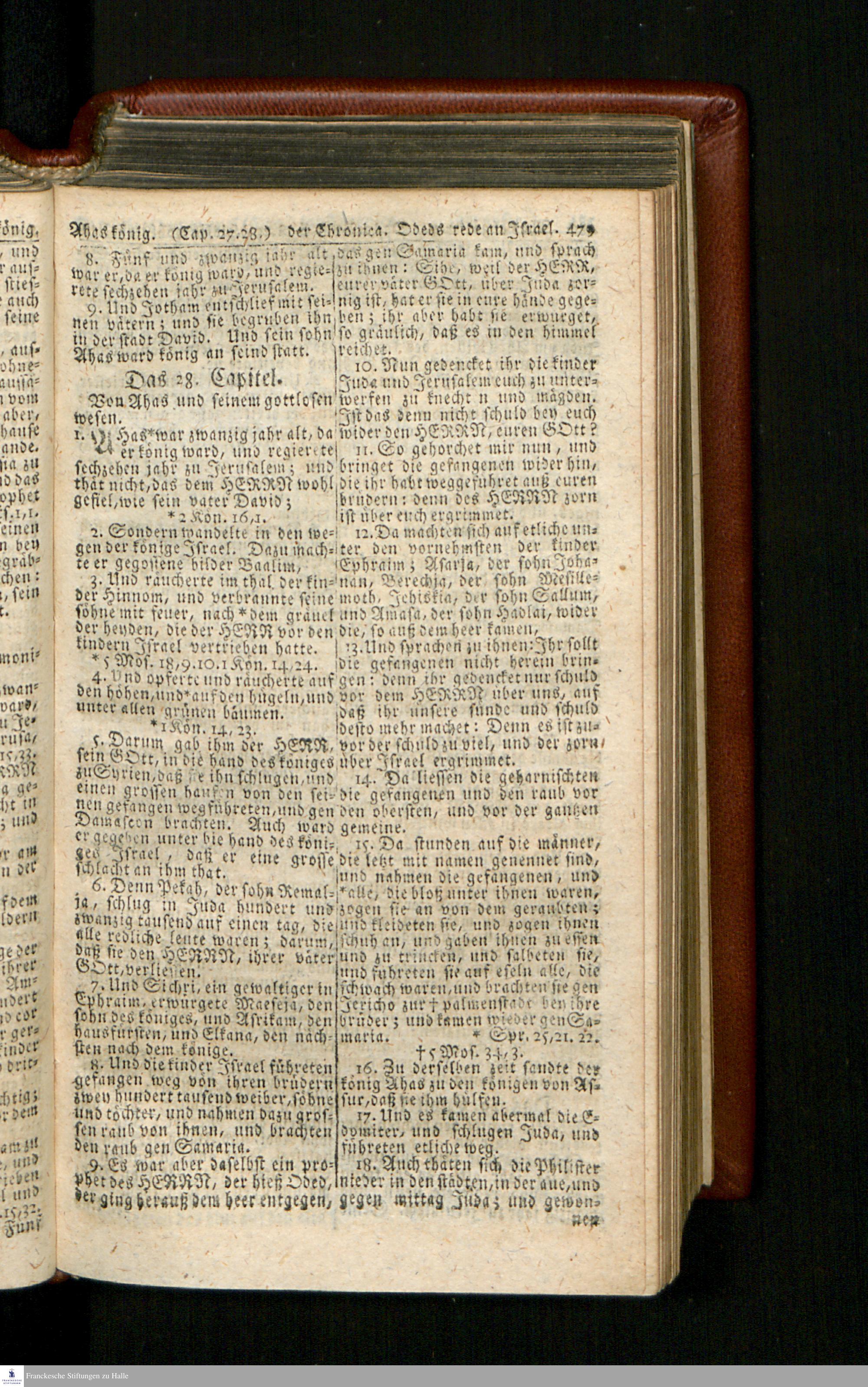 Biblia, Das ist: Die gantze Heil. Schrift Altes und Neues Testaments / Nach der Teutschen Ubersetzung D. Martin Luthers; Mit iedes Capitels kurtzen Summarien/ und nöthigsten Parallelen; Mit Fleiß übersehen, Und gegen einige/ sonderlich erstere/ Editiones des sel. Mannes gehalten, auch an unterschiedlichen Orten nach denselben eingerichtet, und von vielen in den bisherigen Exemplarien hin und wieder eingeschlichenen druckfehlern gesaubert. Nebst einer Vorrede Hn. Baron Carl Hildebrands v. Canstein.