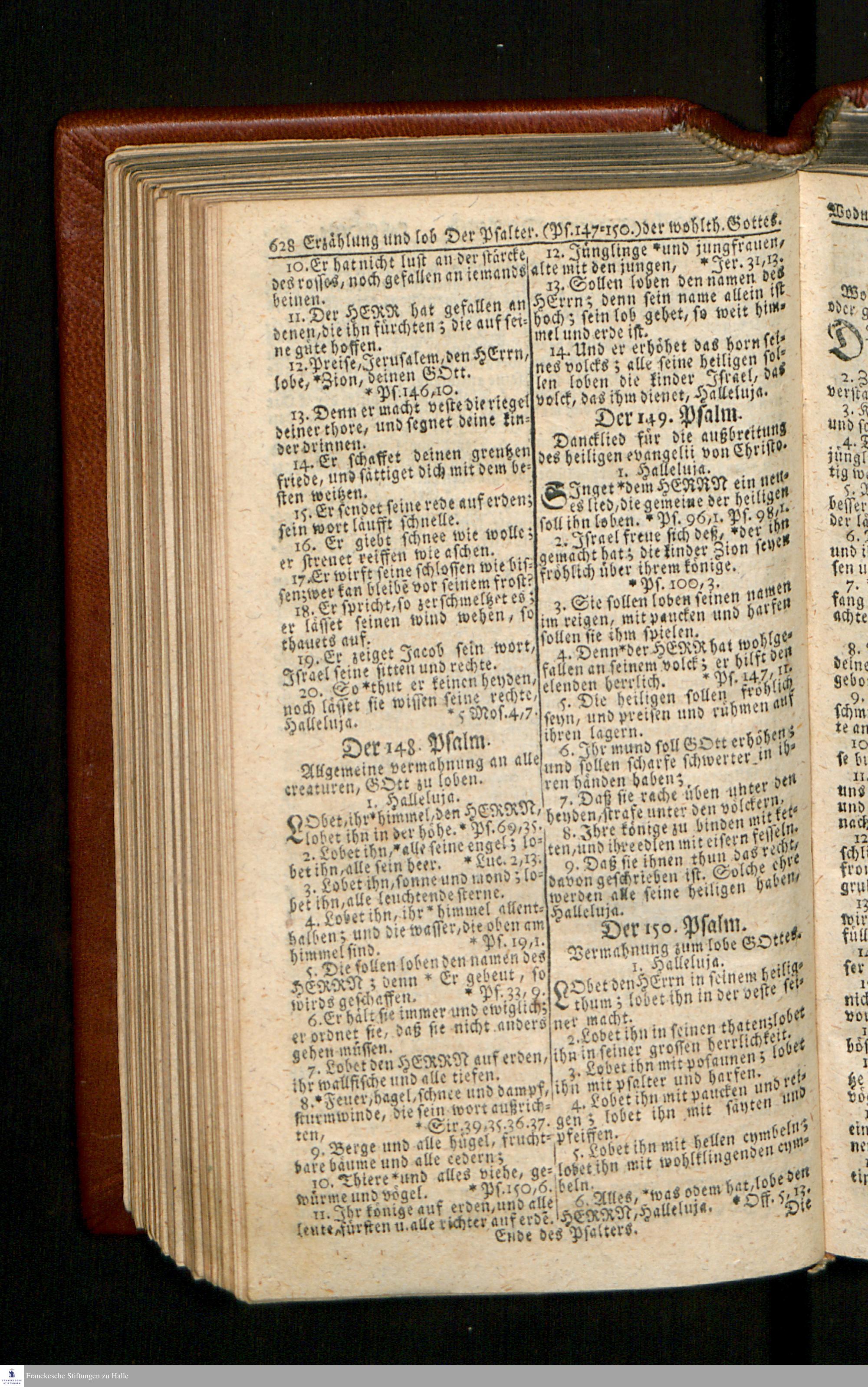 Biblia, Das ist: Die gantze Heil. Schrift Altes und Neues Testaments / Nach der Teutschen Ubersetzung D. Martin Luthers; Mit iedes Capitels kurtzen Summarien/ und nöthigsten Parallelen; Mit Fleiß übersehen, Und gegen einige/ sonderlich erstere/ Editiones des sel. Mannes gehalten, auch an unterschiedlichen Orten nach denselben eingerichtet, und von vielen in den bisherigen Exemplarien hin und wieder eingeschlichenen druckfehlern gesaubert. Nebst einer Vorrede Hn. Baron Carl Hildebrands v. Canstein.