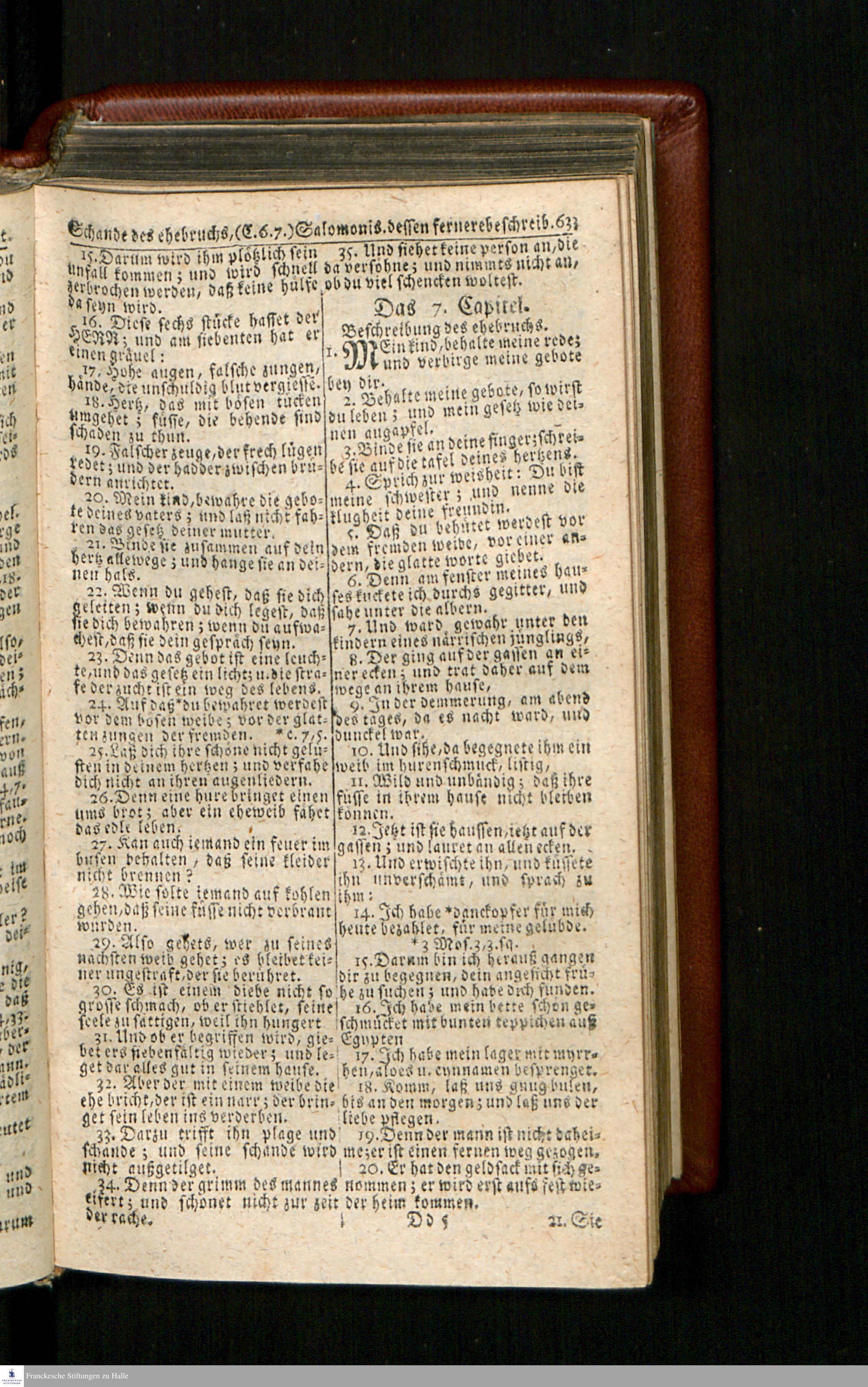 Biblia, Das ist: Die gantze Heil. Schrift Altes und Neues Testaments / Nach der Teutschen Ubersetzung D. Martin Luthers; Mit iedes Capitels kurtzen Summarien/ und nöthigsten Parallelen; Mit Fleiß übersehen, Und gegen einige/ sonderlich erstere/ Editiones des sel. Mannes gehalten, auch an unterschiedlichen Orten nach denselben eingerichtet, und von vielen in den bisherigen Exemplarien hin und wieder eingeschlichenen druckfehlern gesaubert. Nebst einer Vorrede Hn. Baron Carl Hildebrands v. Canstein.