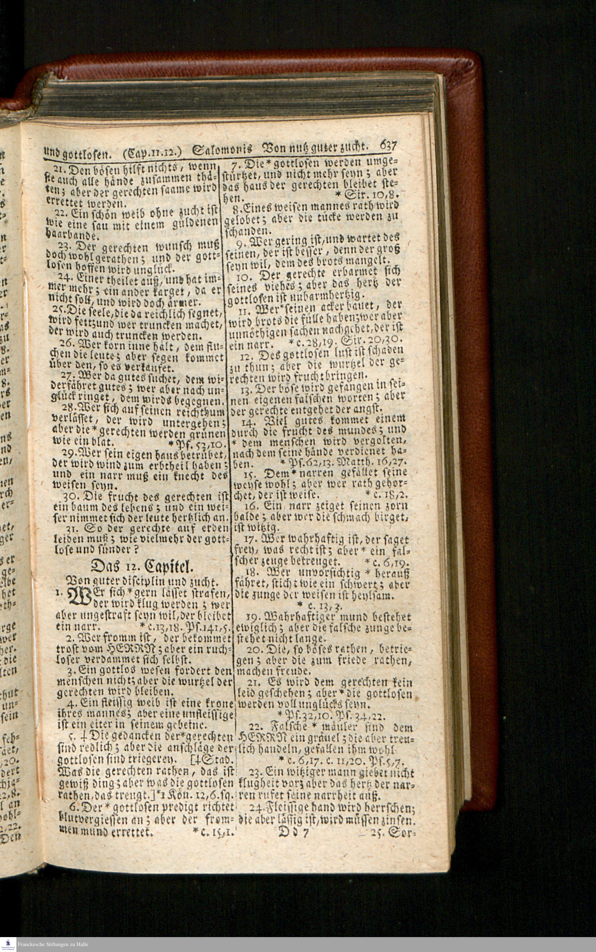 Biblia, Das ist: Die gantze Heil. Schrift Altes und Neues Testaments / Nach der Teutschen Ubersetzung D. Martin Luthers; Mit iedes Capitels kurtzen Summarien/ und nöthigsten Parallelen; Mit Fleiß übersehen, Und gegen einige/ sonderlich erstere/ Editiones des sel. Mannes gehalten, auch an unterschiedlichen Orten nach denselben eingerichtet, und von vielen in den bisherigen Exemplarien hin und wieder eingeschlichenen druckfehlern gesaubert. Nebst einer Vorrede Hn. Baron Carl Hildebrands v. Canstein.